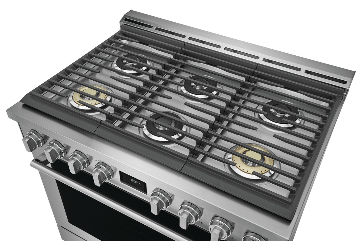 - Full-framed linear grates, sturdy knobs, premium brass burner accents and the Electrolux signature pinstriped glass lend to the sleek design that make this range a focal point of your kitchen