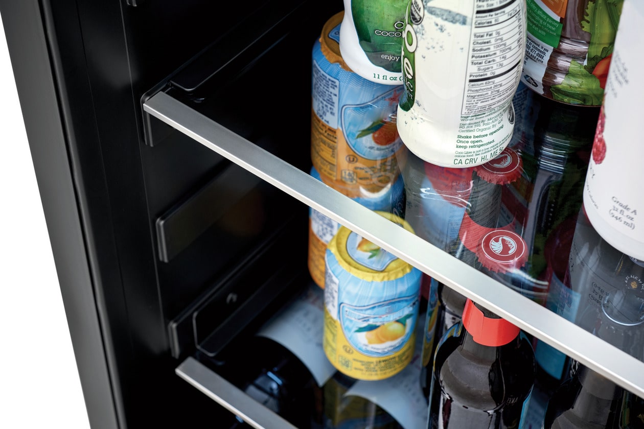 - This beverage center features premium glass shelving and sleek stainless steel trim and handles to enhance the look of any kitchen