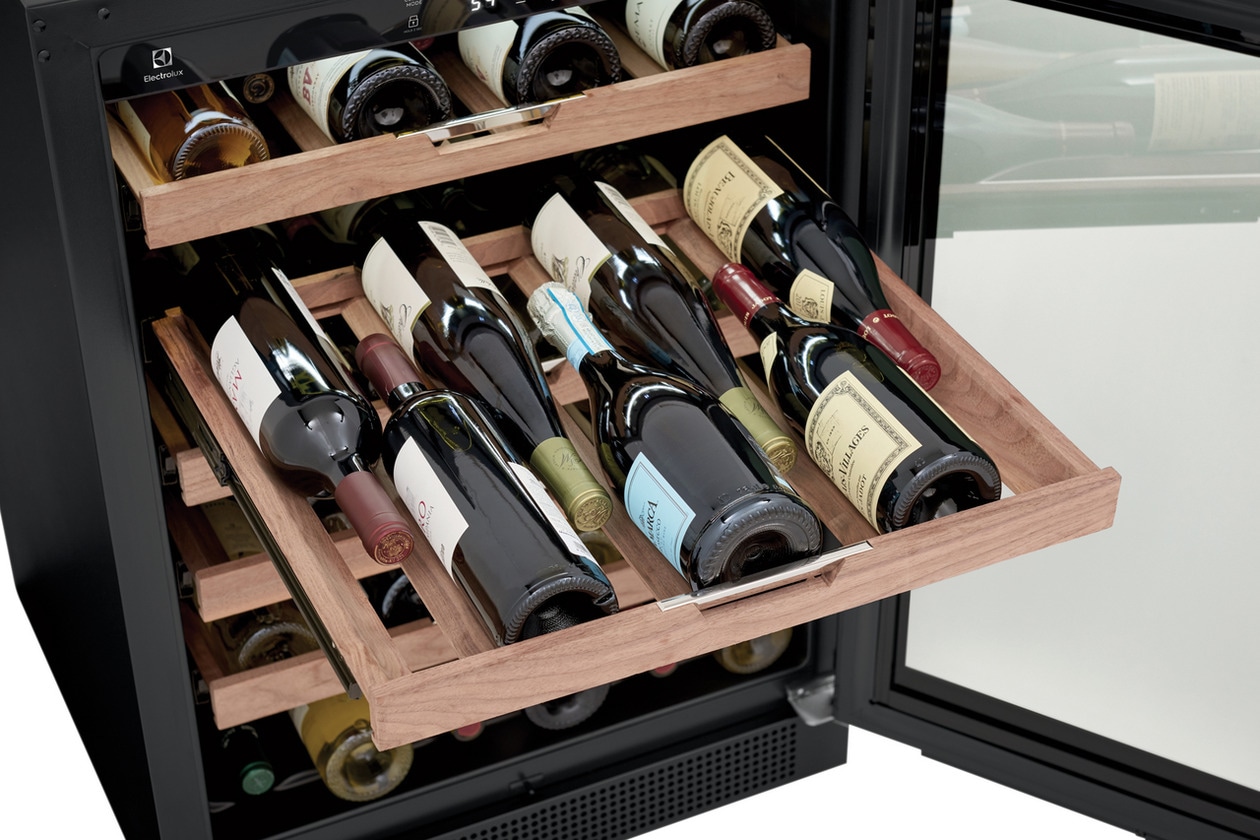 - Store all bottle shapes and sizes - even your favorite champagne - without scratching the labels with Electrolux wide-slat walnut shelving. Shelves fully extend enabling ease of organization and access to your wine collection. Premium walnut slats cushion wine from harmful vibration