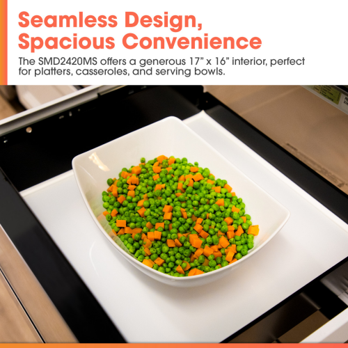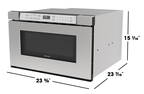 The Sharp SMD2430MS 24 in. Microwave Drawer Oven is the perfect blend of convenience, intuitive design, and accessibility, boasting a spacious 1.2 cu. ft. capacity and 950 Watts of cooking power. Utilize built-in Sensor Cook ® Technology and cook with confidence, helping take the guesswork out of cooking and defrosting by sensing the foods moisture and automatically setting the ideal cooking time. With easy-to-use defrost menu options, meal prep becomes simpler and more efficient. The Automatic Drawer System ensures a smooth, mess-free close with the touch of a button or a gentle nudge. Inside, the spacious 17 by 16 interior easily accommodates large platters, casseroles, and serving bowls, making it a practical solution for busy households. The control panel is purposefully angled for easy-to-use operation. Audible signals can be turned on or off, and the control panel can be locked down to prevent accidental operation by small children and while cleaning. With a bright interior light and viewing window you can easily monitor your cooking creations. Best of all the flat interior design makes cleanup a breeze. Finished in stainless steel with a sleek silver control panel, this appliance adds a modern and clean look to any kitchen. The Built-In Airflow venting allows for either traditional proud mount installation or flush mounting for a streamlined finish without the need of additional trim kits or vent deflectors. Install into an island, peninsula, standard cabinetry, beneath other 24-in. built-in appliances, or utilize the optional pedestal accessory to slide into a standard dishwasher cutout for a built-in look, without the need for custom cabinetry. Engineered with ADA compliance in mind, the under-counter design provides flexibility to fit almost any lifestyle. With a modern style and impressive features, the Sharp SMD2430MS 24 in. Microwave Drawer Oven is the perfect solution for your kitchen.