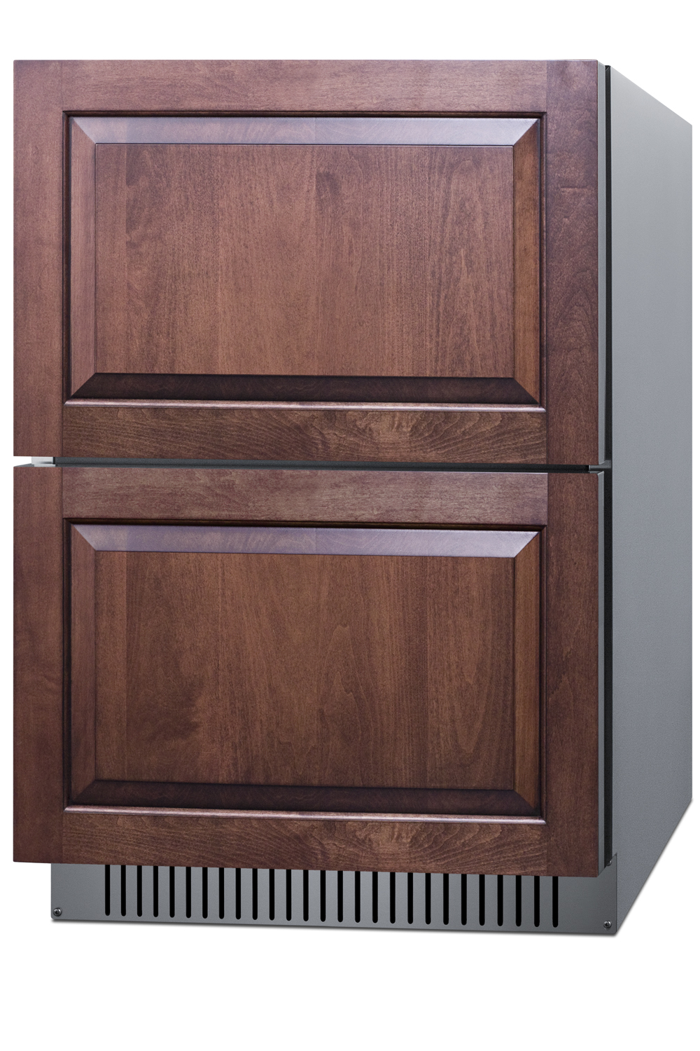 Summit manufactures an extensive selection of drawer refrigeration designed to bring elegant style and modern convenience to any undercounter space, with ADA compliant choices designed for indoor and outdoor installation. Sized at just under 24" wide and 32" high, model ADRF244CSS is a 2-drawer refrigerator-freezer perfectly designed for built-in or freestanding installation in ADA compliant settings with lower counter height. The cabinet and drawers are constructed from weatherproof stainless steel for safe use in outdoor kitchens, with a sealed back to protect all components from the elements. A stainless steel kickplate and sleek horizontally mounted handles complete the stylish look. The drawer fronts can also accept user-provided overlay panels to create a custom look that blends into existing cabinetry designs (panel dimensions: 23.43" W x 14.1" H at 3/4" thick).Inside, the ADRF244CSS has a generous 3.3 cu.ft. capacity to accommodate your storage needs. Both the top drawer refrigerator and bottom drawer freezer utilize frost-free operation with fan-forced cooling, ensuring an even temperature distribution with minimum user maintenance. A digital thermostat, located atop the refrigerator drawer, makes it easy to manage the temperature, with an LED display that can be read in Celsius or Fahrenheit. Two adjustable, removable dividers allow you to separate the drawer compartments into two (freezer) or four (refrigerator) zones to easily accommodate a variety of sizes. A full-width sliding removable chrome basket offers added storage convenience, while white LED lighting in the refrigerator drawer makes it easy to view stored contents. A child lock will disable the digital controls after two minutes of inactivity to prevent accidental adjustments. Additional features include audible alarms for high-temperature fluctuations and open drawer alerts, a temporary memory function to recover all settings in the event of power loss, and sabbath mode to disable certain elec