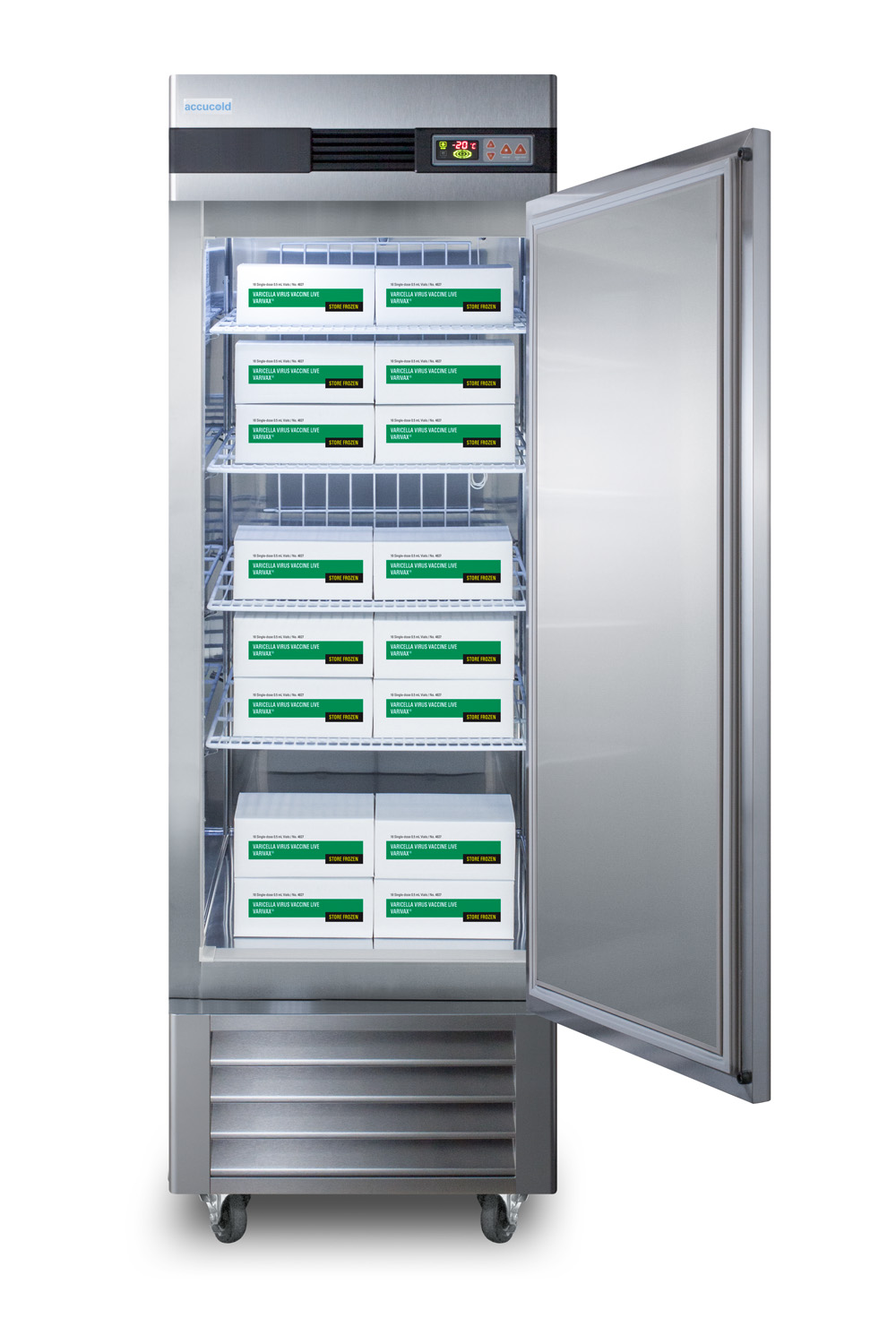 Accucold's Pharma-Lab Performance Series features reach-in refrigerators and matching freezers designed and purpose-built to meet the demanding needs for pharmacy, medication, vaccine, laboratory, and life science applications.The AFS23ML is a 23 cu.ft. all-freezer with an adjustable control range from -30 to -15ºC. The microprocessor temperature controller features a large digital LED display viewable in Celsius or Fahrenheit, making it easy for staff to manage and monitor the temperature. The unit is equipped with an air sensor for rapid control response and a product sensor for a more accurate reading of the interior, including a display of the min/max temperature in 15 minute increments The audible and visual temperature alarm sounds if the unit rises or falls above a user-set range. Additional alarms include a power failure alert, door open alarm, and a condenser cleaning reminder. Inside, the AFS23ML utilizes adjustable cycle defrost operation to avoid temperature spikes, with a top-mounted forced air cooling system to ensure rapid temperature recovery. Four vinyl-coated wire shelves on cantilevered clips allow you to accommodate virtually any sized item. The LED lighting displays automatically when the door is open, providing a full and energy efficient display.The AFS23ML features a durable stainless steel cabinet and interior, with a sealed back for easier cleanup. We include a set of casters (2 locking) for optional installation. A factory-installed lock offers added security, with two keys included for your facility. Magnetic door gaskets ensure a strong seal. The door is self-closing to help protect contents, but will remain open at 90º for easier loading. Designed with hydrocarbon refrigerant, the AFS23ML provides an energy efficient solution to large capacity storage. This unit is Pyxis, Omnicell, and AcuDose RX compatible and meets NSF-7 commercial standards. For a matching refrigerator, see the ARS23ML. NOTE: Accucold freezers are purpose-built to th