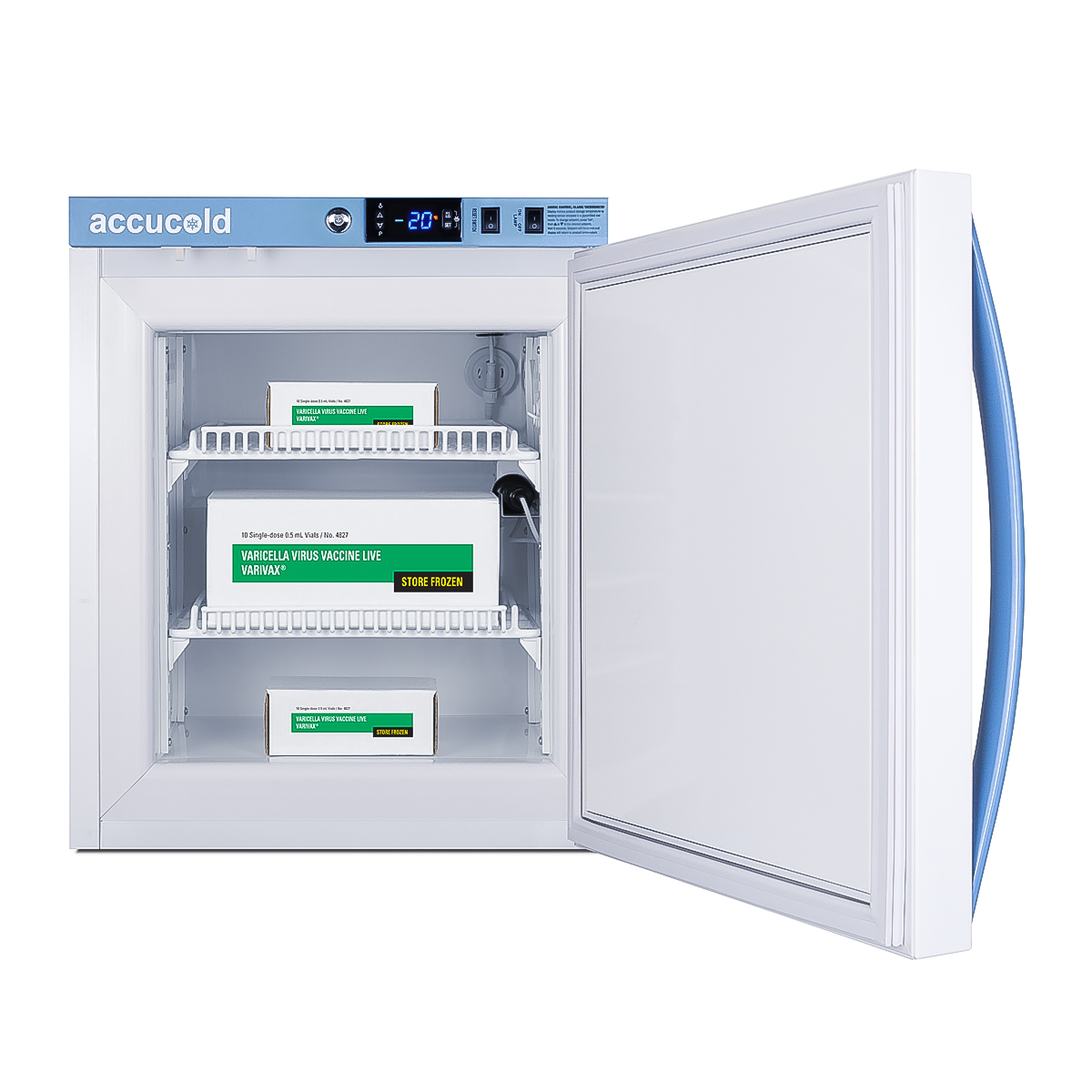 Accucold's Pharma-Vac Performance Series are upright freezers are designed and purpose-built for pharmacy, medication, and vaccine applications to support meeting CDC/VFC/VFA guidelines.The AFZ1PV is a 1.4 cu.ft. all-freezer with a temperature range of -30°C to -10°C as recommended for a variety of vaccines and pharmaceuticals. The microprocessor temperature controller is externally located to minimize door openings, helping to protect stored contents from ambient temperature. The buffered temperature probe is encased in a glycol-filled bottle to better simulate temperature of the stored product, with an additional sensor that reads air temperature to ensure superior temperature control. The current and min/max temperature display is viewable in Celsius or Fahrenheit to the nearest tenth of a degree. The audible and visual temperature alarm sounds if the unit's interior goes out of range. Additional alarms include a power failure alert, door open alarm, and sensor failure alarm. This model is equipped with remote alarm contacts in the rear and a 1/2" probe port on the right side to accept additional monitoring devices. A hospital grade cord with 'green dot' plug is also included for added safety in high traffic areas.Inside, this freezer features adjustable plastic-coated wire shelves that can be positioned at 1/2" increments to accommodate virtually any sized item. This unit includes LED internal lighting with an on/off rocker switch. The interior is constructed from white powder coated metal to ensure added durability and better temperature retention. Static manual defrost cooling helps to ensure stable temperature conditions.The AFZ1PV comes in a white cabinet finish with a blue accented control panel. The factory-installed antimicrobial handle is powder-coated with naturally occurring silver ions, which help to reduce the spread of germs, allowing for a safer, cleaner user experience. The user-reversible door ships with a right hand swing and self-closing functi