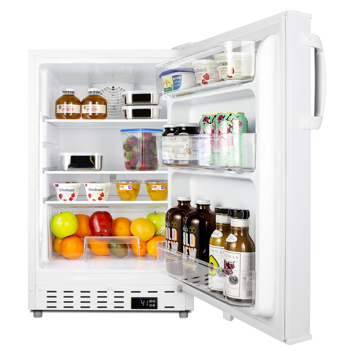 Summit Appliance offers a quality selection of 20" wide built-in undercounter all-refrigerators designed for installation under lower ADA compliant counters, with advanced features for user convenience.The ALR46W is sized at 32" high to fit under lower counters complying with ADA guidelines for accessibility. The fully finished textured white cabinet allows freestanding use, while the front-breathing system means this unit can be built-in with minimum clearance. The user-reversible door is 3" thick for efficient insulation, with a handle included for added convenience. This unit comes with a right angle cord to allow for easier placement without added depth. A digital thermostat, located in the kickplate, makes for easy temperature management with a readout in Fahrenheit or Celsius. Inside, the ALR46W features an all-white interior for easy cleaning and viewing of contents. An LED light located toward the front of the unit attractively illuminates the interior when the door opens. Automatic defrost operation ensures minimal user maintenance, with an internal fan to help ensure even cooling throughout the 3.53 cu.ft. interior. Three adjustable glass shelves offer optimal storage options for large and small items, while a pull-out crisper drawer provides storage for fruits and vegetables. Three removable door racks accommodate additional storage as needed. The user-set high and low-temperature alarms provide added security should the temperature go beyond the setpoint, while the open door alarm sounds if the door is ajar over one minute for added peace-of-mind. These alarms can be disabled depending on your needs. Sized at just 20" wide, the ALR46W is the perfect addition for space-challenged environments seeking dependable freezer options in a durable design. For a complete set, pair this unit with the matching ALFZ36 all-freezer. Additional choices are available in stainless steel and panel-ready exterior finishes.