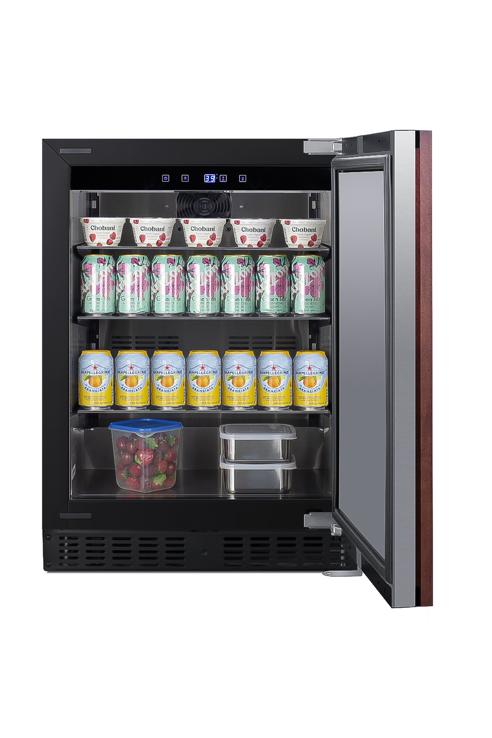 Summit's shallow depth series of built-in undercounter refrigeration brings full functionality to kitchen islands, wet bars, and other settings with space limitations.Model ASDS2413IF is a 24" wide all-refrigerator sized under 18" deep. It comes in a 32" height to fit under lower ADA compliant counters, with adjustable legs and a sliding kickplate cover that also allows you to raise the overall height up to 34" to fit standard counter spaces. The front-breathing system allows built-in installation, while the fully finished black cabinet also allows freestanding use. This unit has a sealed rear and right angle cord for a better fit. The door features a European-style fully articulating hinge for smooth opening. This also allows the door to accept full panel overlays, allowing users to seamlessly blend the unit into their own cabinetry design (panel size: 28.38" H x 23.4" W; maximum weight: 10 lbs.). Note: this unit ships with a handle for optional use (not shown in image). Customers may also supply their own (as shown) to better match their existing cabinetry.Inside, the ASDS2413IF features stainless steel construction for improved durability and sanitation. Fan-forced cooling ensures even temperature distribution and fast temperature recovery. Recessed LED lighting offers an attractive yet efficient look. The digital thermostat makes it easy to manage the interior temperature. This unit includes cantilevered shelving in chrome for flexible storage. Additional features include an open door alarm, high temperature alarm, and Sabbath mode setting that lets you disable some of the electrical elements during periods of observance.The ASDS2413IF refrigerator is ETL-S listed to NSF-7 commercial standards but can also be used in the home. With its deluxe style, user-friendly features, and uniquely shallow depth, this unit offers premium value for a variety of settings. Additional 18" deep choices are available in 15", 19", and 24" widths, including outdoor refrigerators, re