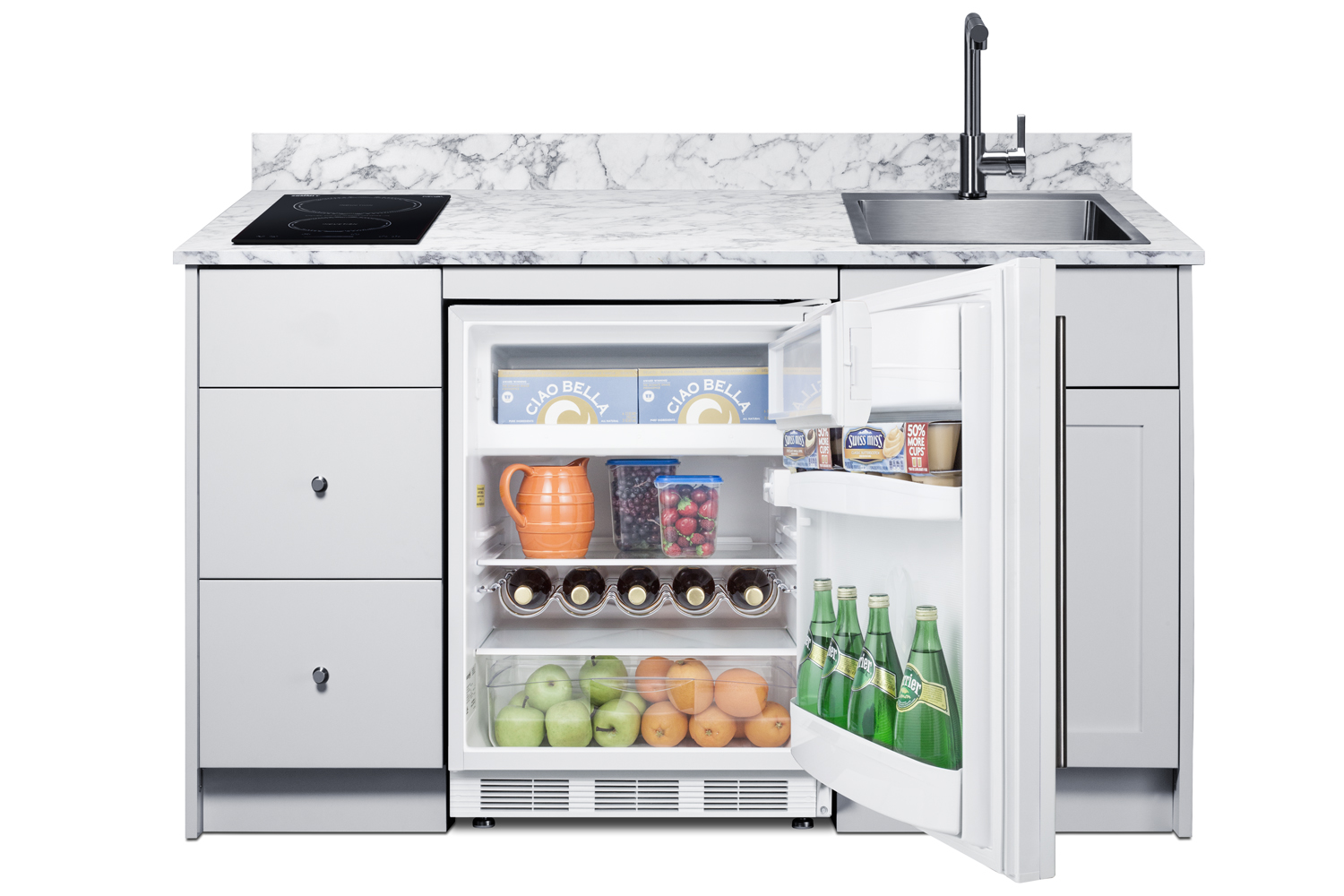Summit's Turnkey Kitchens & Bars feature pre-installed cabinetry and matching appliances to bring effortless style & instant living to home bars, ADUs, tiny houses, rental properties, office break rooms, and hospitality settings.The Caldera is a 63" wide kitchenette in a classic white finish. It features hardwood construction and a countertop made from a water-resistant laminate material with a marble look, with a pre-installed 2-burner induction cooktop included. We include a stainless steel sink with faucet and 5 cu.ft. refrigerator-freezer for food storage. For dry storage, this model has a two-door cabinet and two soft-close drawers. We also supply the door knobs in an attractive brushed nickel finish. The cabinetry comes in a classic shaker style. For this unit with the sink located on the left side, see model CALDERAWH35ISINKL.Model CALDERAWH35I includes Summit's CT661WIF, a 24" wide ENERGY STAR certified refrigerator-freezer that utilizes automatic defrost operation in the fresh food section and manual defrost operation in the freezer to ensure items stay frozen. Inside, the CT661WIF includes adjustable glass shelves for spill-proof storage and easier cleaning, as well as a scalloped wine shelf to hold wine and champagne bottles safely in place. Door racks offer additional convenience for tall bottles and condiments and a clear crisper drawer ensures your produce is kept under the ideal conditions. This model includes automatic interior lighting and an adjustable dial thermostat. The door comes with a pre-installed stainless steel handle and wood panel to seamlessly blend into the cabinet.This kitchenette also features Summit's SINC2B115, an ENERGY STAR certified 12" wide 2-zone induction cooktop. The pre-installed cord includes a 3-prong NEMA 5-15P plug for fast setup. The surface is made of jet black glass for a contemporary look that's easier to clean. The rear 1800W element is sized at 8 1/4", while the front element is 1/4" wide and 1300W . POWER NOTE: D