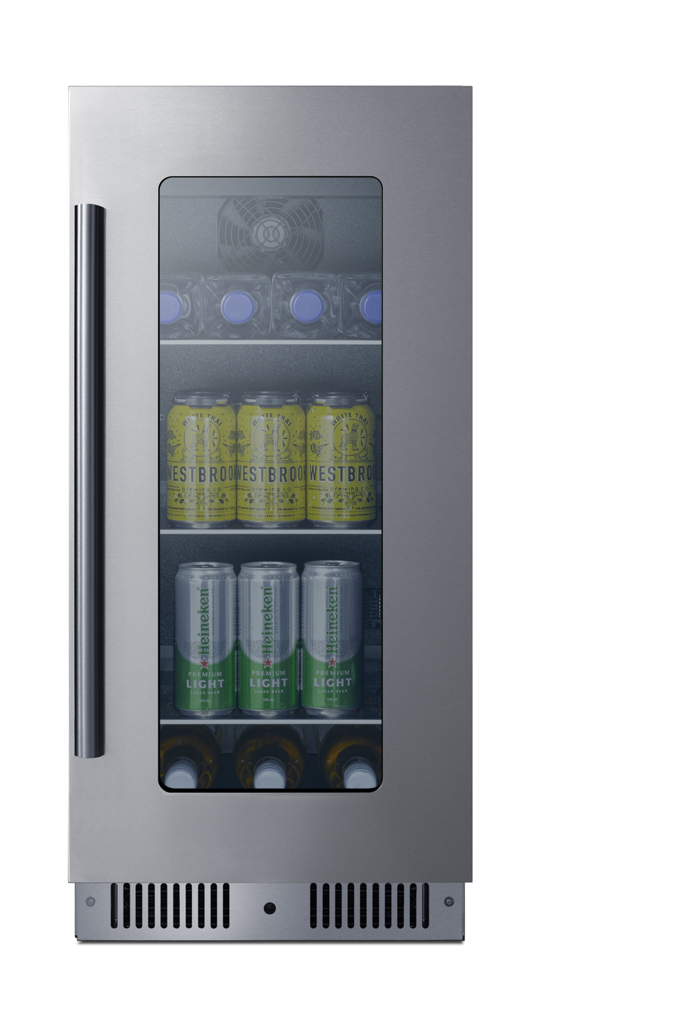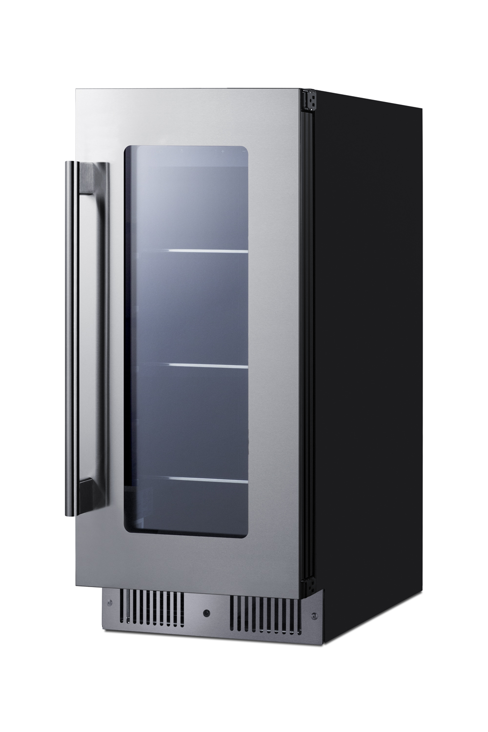 Summit's collection of built-in undercounter beverage centers brings full functionality and premium style to kitchens everywhere.Summit's CL156BV1 is a 15" wide beverage center designed for residential or commercial settings. The front-breathing system allows built-in installation, while the fully finished black cabinet allows freestanding use. A seamless 304 grade stainless steel trim blends smoothly into the gently tinted glass door for an elevated look, with a professional stainless steel handle included. This unit has a sealed rear and right-angle cord for an improved flush fit. The fully articulating European-style hinge design ensures a smoother opening. A lock is located in the kickplate for added convenience and security. Inside, model CL156BV1 features fan-forced cooling to ensure even temperature distribution and fast temperature recovery. This unit includes LED interior lighting for an attractive illumination of its contents. Three adjustable glass shelves and a slotted floor ensure flexible storage to accommodate any size bottle or can. The interior control panel includes a digital thermostat for easy and intuitive operation, with a readout viewable in Celsius or Fahrenheit. Additional features include a user-reversible door, a sabbath mode for observance periods, and a temperature memory function to restore the set temperature in the event of power loss. A built-in alarm audibly warns if the door is left ajar or if the unit rises or falls out of the recommended temperature.Uniquely styled and fully featured, the CL156BV1 brings true convenience and a deluxe aesthetic to kitchen spaces. For this unit with a 24" width, see model CL24BV1. Create a matching set by pairing this with our 15" wide wine cellar, model CL155WC1, or our 24" wide wine cellar, model CL244WC2. Note: This unit comes with an anti-tip bracket that should be installed to help prevent tipping of the unit for added safety.Explore all of Summit's beverage centers and wine cellars at summita
