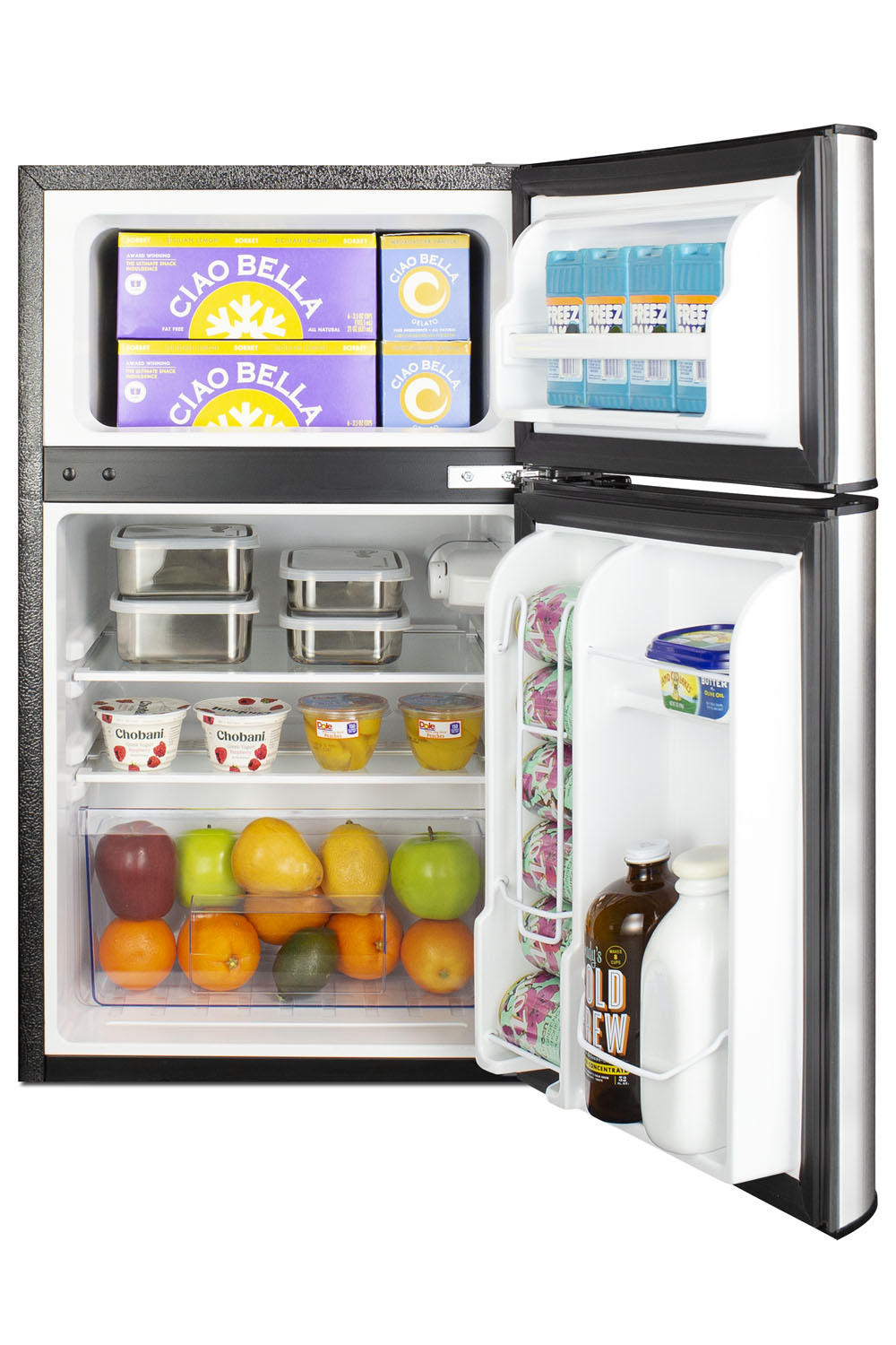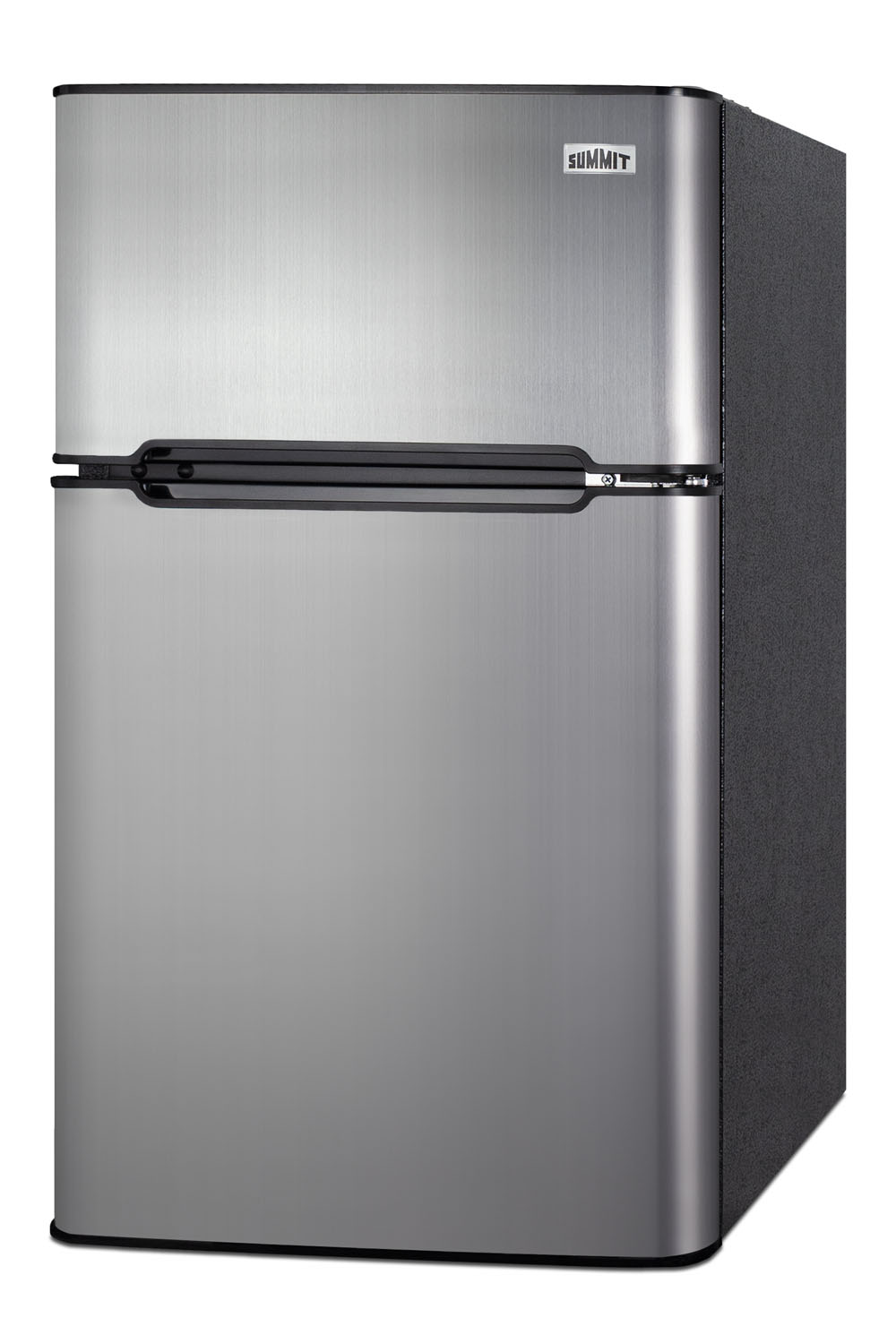 Summit's ENERGY STAR qualified collection of compact refrigerator-freezers offers uniquely sized units with energy-efficient performances.The CP34BSSADA is a freestanding two-door refrigerator-freezer sized at 19" wide. The cabinet is 32 5/8" high, with an additional 1/8" hinge cover for use in ADA compliant applications with lower counter height requirements. This unit features a jet black cabinet and reversible stainless steel doors for added convenience. It has a sealed back that allows for a better fit and easier cleaning. Inside, the CP34BSSADA utilizes a dual evaporator system to separately cool the auto defrost refrigerator section and manual defrost freezer compartment for improved overall performance. The refrigerator includes an adjustable glass shelf for protection against spills, a large crisper drawer to keep produce fresh, and door storage for tall bottles. The "Dispense-A-Can" door compartment can hold up to six standard-sized beverage cans for convenient access. A dial thermostat with seven temperature settings make for easy temperature management, while an interior light illuminates the white interior for an easy view of stored contents. The generously sized freezer section includes a large door shelf for easy storage. An ice scraper and ice cube tray are also included.The CP34BSSADA is ENERGY STAR qualified with an efficient performance designed to save on utility costs and energy usage. With its unique size and quality design, this unit is ideal for college dorms, small apartments, offices, and other settings in need of a reliable, energy-efficient compact refrigerator-freezer. For this unit in white, see the CP34WADA.
