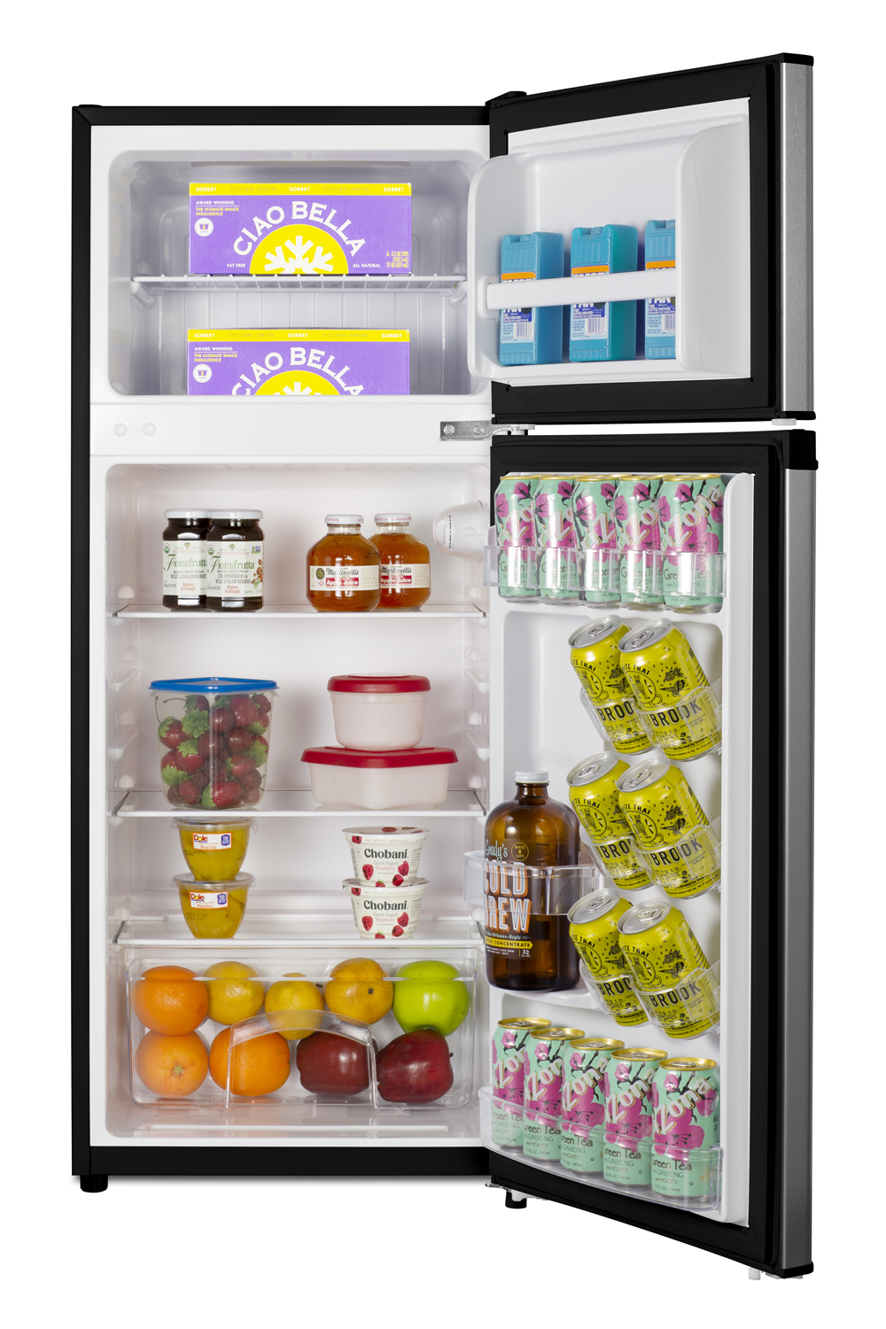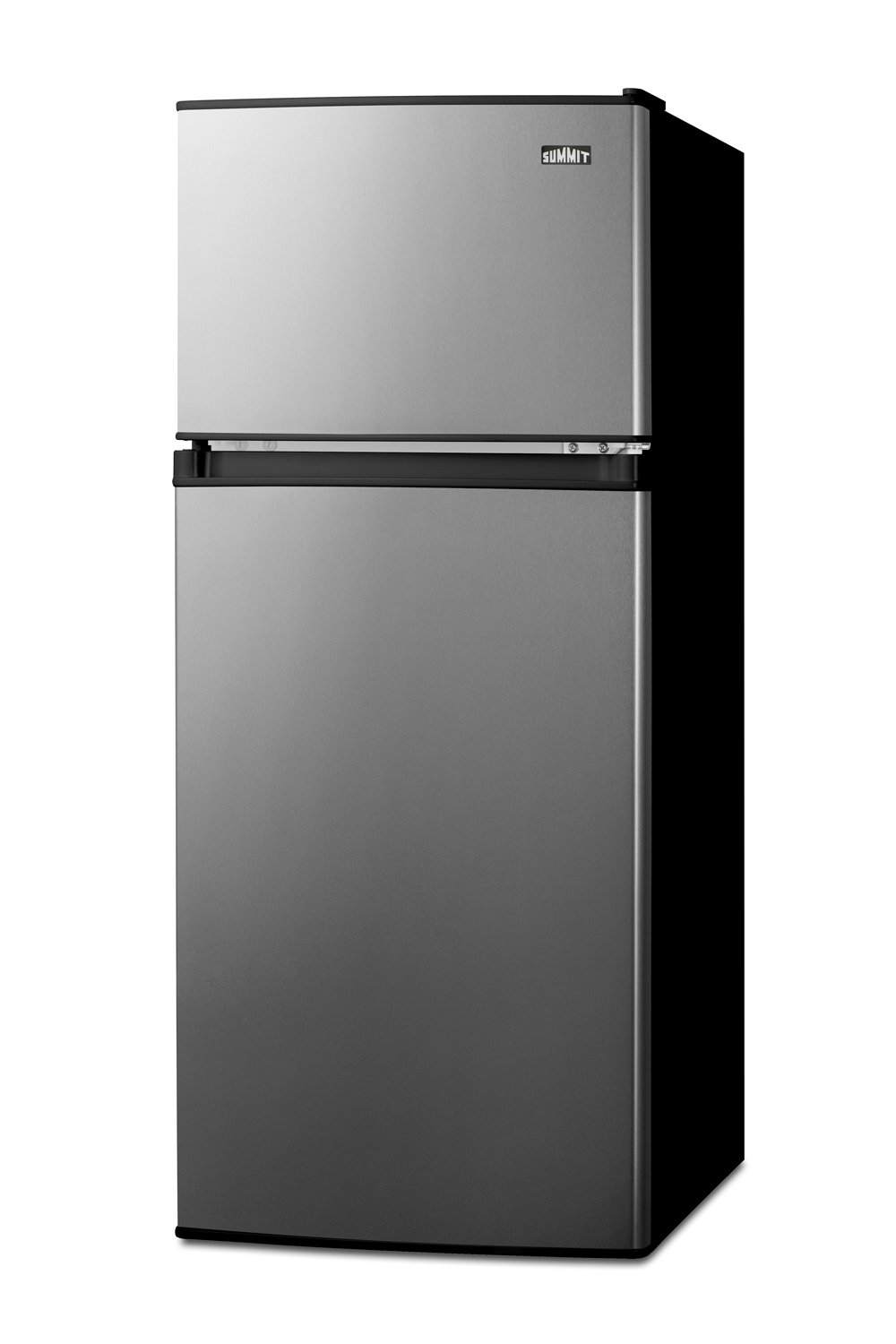 SUMMIT's line of refrigerator-freezers feature slim dimensions for smaller kitchens and superior construction for years of reliable service.The CP73PL is a two-door refrigerator-freezer sized just under 19" wide, with a 45" height that meets ADA guidelines to provide accessibility to wheelchair users. It features a black cabinet finish with user-reversible fingerprint-free doors with a stainless steel look. The sealed back allows for a better fit and easier cleanability. Inside, the CP73PL utilizes low maintenance automatic defrost in the refrigerated section and static manual defrost in the freezer. The refrigerator has two adjustable spill-proof glass shelves for easy storage, while door storage includes a mixture of curved shelves for holding cans and bottles in place and straight shelves for condiments and other refrigerated items for added versatility. A large pull-out crisper drawer keeps your greens fresh. The freezer section comes with a removable wire shelf, as well as a full door rack, for storage convenience. A dial thermostat provides easy temperature management of the 4.5 cu.ft. interior, while the refrigerator section includes an automatic interior light for an easy view of stored contents. With its unique size, ENERGY STAR certified performance, and fully-featured interior, the CP73PL is ideal for studio apartments, dormitories, offices, and other small-spaced environments seeking reliable cold storage in a slim-fitting design. For this unit with a white finish, see the CP72W.