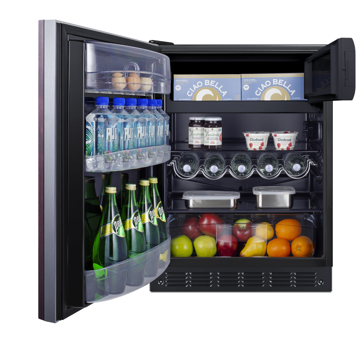 Summit's ADA compliant undercounter lineup of European-made refrigeration features 32" high choices that offer the largest capacity in the industry, including fully featured refrigerators with freezer compartments to meet all of your storage needs.Sized at 32" high with a 24" footprint, model CT66BK2SSIFADALHD is an ENERGY STAR certified refrigerator-freezer designed for residential use under lower ADA compliant counters.The door features an integrated stainless steel exterior frame designed to accept overlay panels, allowing you to create a custom look that can seamlessly blend into your kitchen (panel size: 23 5/16" W x 28 1/4" H and at least 3/4" thick). This unit has a jet black exterior cabinet comes with a left hand door swing. It operates quietly at less than 33 dB.Inside, the CT66BK2SSIFADALHD offers 5 cu.ft. of storage, a higher capacity than virtually any refrigerator-freezer in this size class. It features a black interior liner and black trimmed adjustable glass shelves for spill-proof storage. We also include a removable scalloped steel rack ideal for holding bottles in a horizontal position. A large clear crisper makes it easy to store produce at its best and three clear door racks let you keep condiments in easy reach. A light automatically illuminates the interior when the door is open. Summit's European lineup features classic mechanical controls. The dial thermostat ensures an intuitive, trouble-free performance without any internal boards or chips. The advanced dual evaporator system allows separated cooling of the fresh and frozen food sections. The refrigerated compartment utilizes low maintenance automatic defrost, while the interior freezer compartment is manual defrost to achieve lower storage temperatures ideal for ice cream and other frozen food.The CT66BK2SSIFADALHD is UL listed for residential use. With its large capacity, professional finish, and user-friendly features, this refrigerator-freezer is a convenient option for homes, offices,