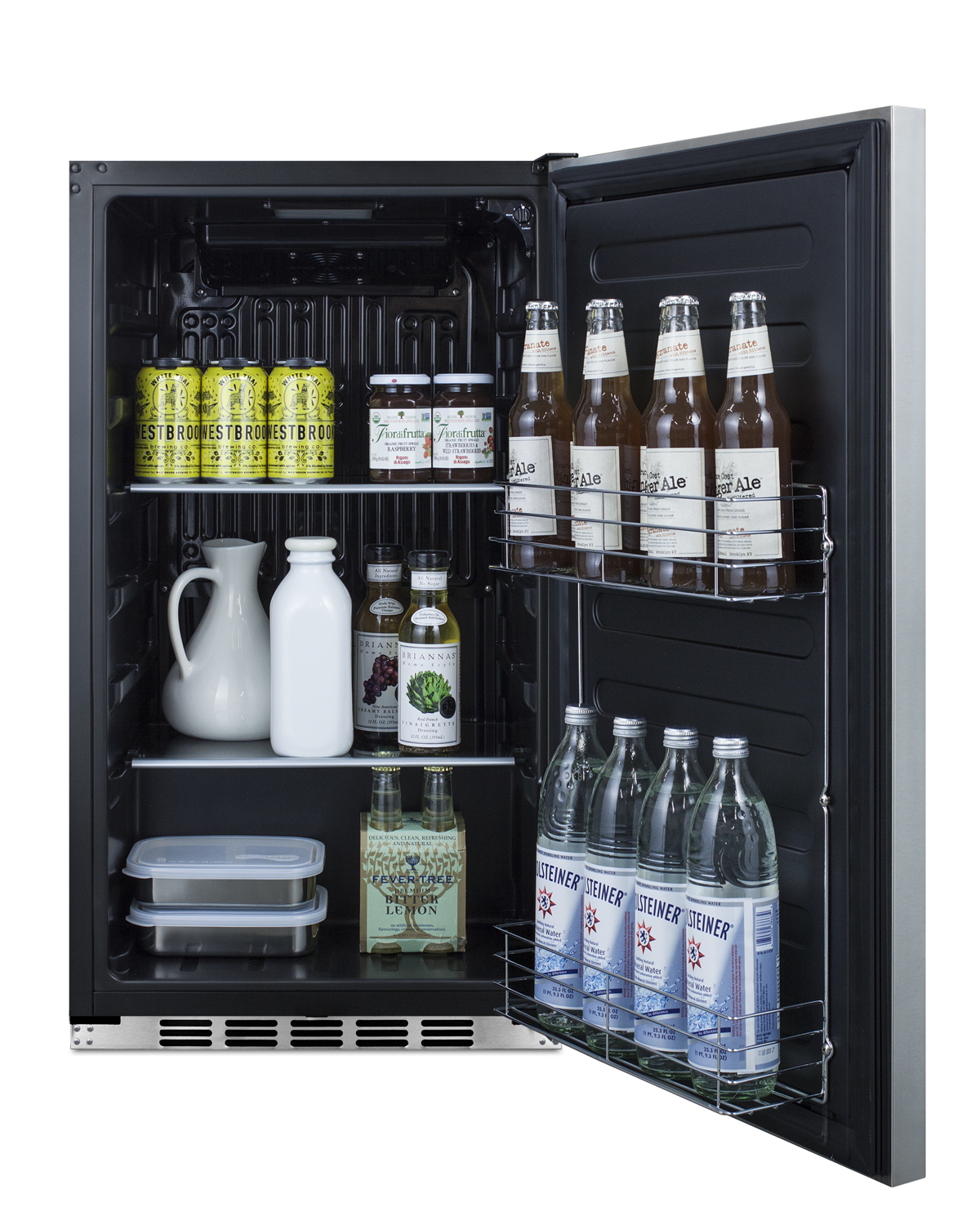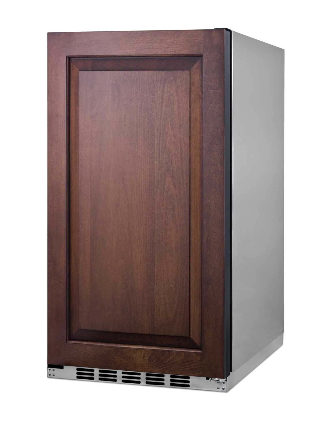 Summit's shallow depth series of built-in undercounter refrigeration includes ENERGY STAR certified choices for improved efficiency in modern style.The FF195CSSIF features a versatile design that meets NSF-7 and UL-471 commercial standards but is also approved for residential use. Sized at just 19 inches wide and 18 inches deep, it comes in a stainless steel wrapped cabinet with a sealed back for easy cleaning of the unit. The height can be adjusted between 33 7/8 and 34 1/2 inches to best suit your space. The stainless steel door features an integrated stainless steel frame designed to accept panels, allowing you to create a custom look under the counter (panel size: 31 9/16 inch H x 18 7/8 inch W at 3/4 inch thick). Customers provide their own handle to best match their setting. The space-saving right-angle plug and integrated hinge provide added flexibility in unit placement.Inside, the FF195CSSIF utilizes an internal fan to ensure the unit is evenly cooled from top to bottom. An automatic defrost system ensures minimal user maintenance, while LED lighting allows full visibility of stored items in the jet black interior. Three adjustable slide-out glass shelves provide flexible storage capacity inside the 3.1 cu. ft. interior. A shelving brake system offers added safety when moving and storing contents, while two chrome door racks are ideal for storing condiments, canned beverages, and other larger items. The dial thermostat, with seven temperature settings, is located in the front upper-right corner for easy temperature management. The FF195CSSIF is ENERGY STAR certified and designed for built-in or freestanding use. For a similar glass door unit commercially approved for outdoor use, see the SPR489OSCSSPNR.