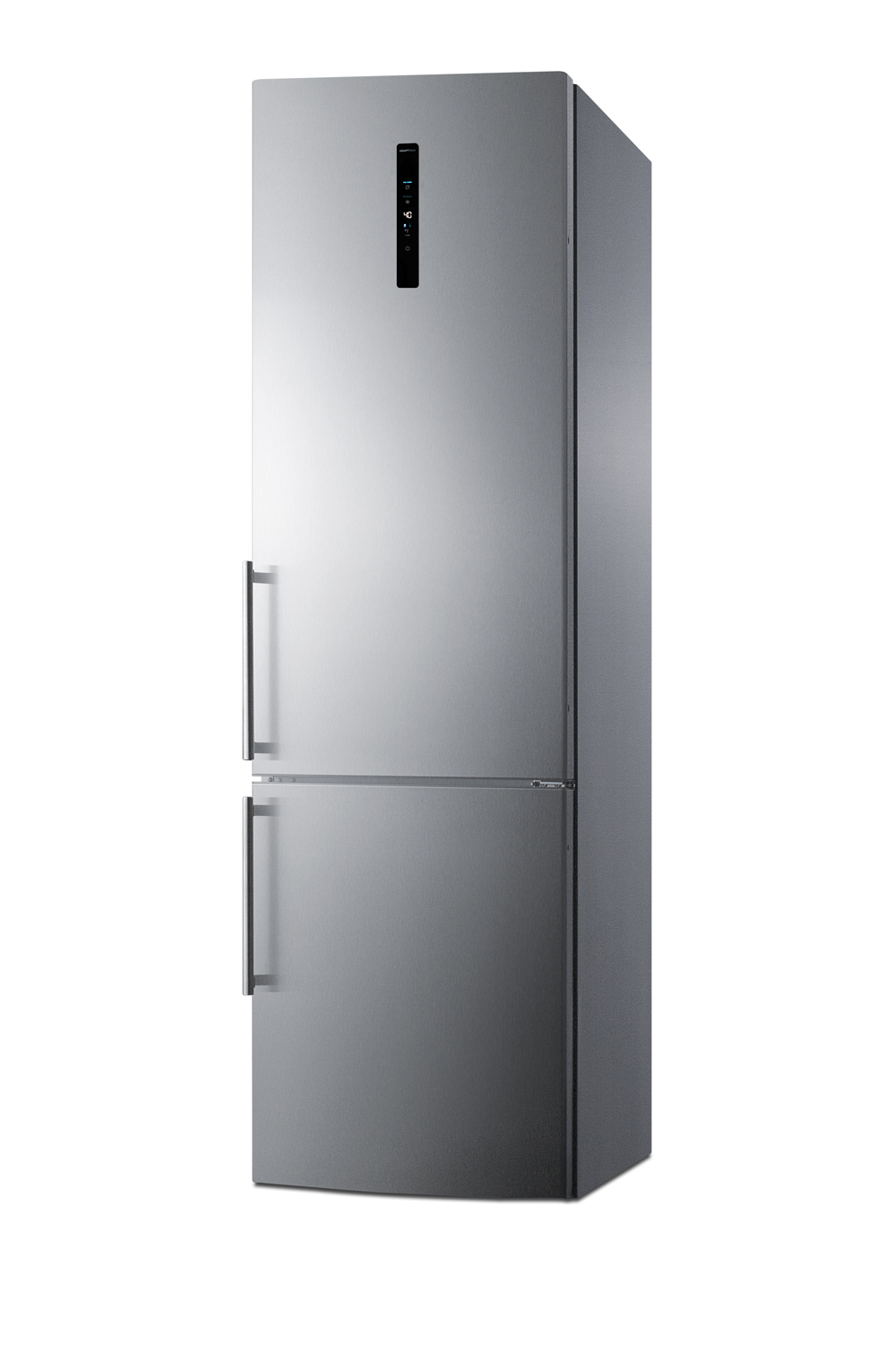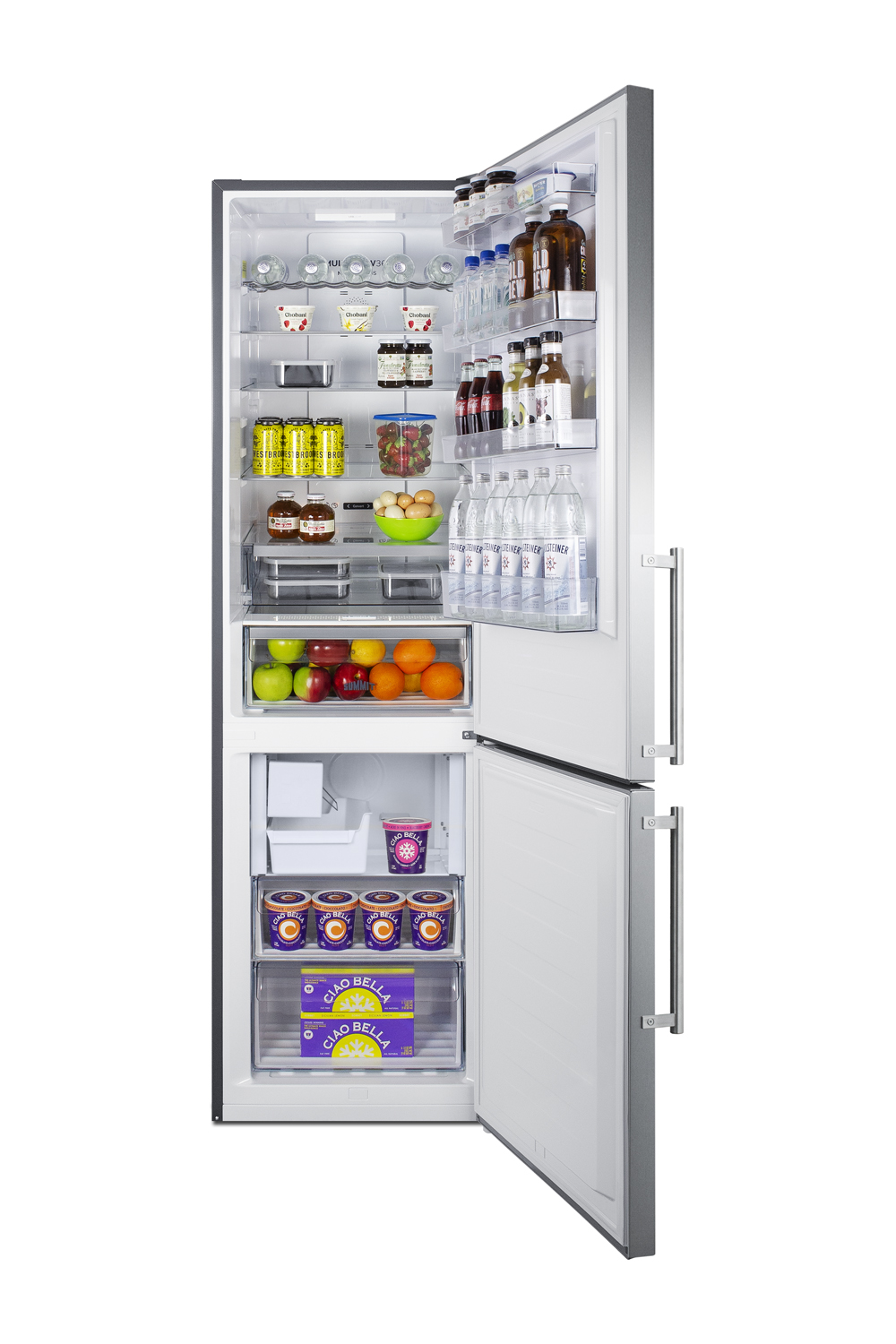 Bring European luxury to small kitchen spaces with Summit's premium counter depth bottom freezer refrigerators, sized with a 24 inch footprint for an easy fit and available with factory-installed icemakers for user convenience.Model FFBF181ES2IM offers nearly 12 cu.ft. of storage capacity in a uniquely slim and shallow fit under 24". The real stainless steel doors feature a vertical grain and a gentle curve, with pro style handles and a textured gray cabinet to complete the elegant, modern look. The sealed back and right angle plug help to ensure a clean fit. This unit comes with a right hand door swing (see model FFBF181ES2IMLHD or add option LHD to have this reversed). Designed and manufactured in Europe, the FFBF181ES2IM features advanced cooling technology. The digital control panel is located on the door's front, allowing you to adjust the refrigerator or freezer temperature without opening the door. Audible and visual high temperature and open door alarms helps to protect stored contents, while the child lock prevents unnecessary adjustments. The frost-free interior utilizes a MultiFlow Fan system to evenly distribute temperature. This refrigerator is designed with AdaptTech, adaptive intelligent technology that adjusts the cooling to your habits based on the frequency of door openings. Additional features include a fast freeze setting (ideal for loading groceries) and an eco setting. Inside, the FFBF181ES2IM is designed to maximize storage convenience with LED lighting providing a clean display. The refrigerator section includes three slide-out adjustable shelves in spill-proof glass with stainless steel front trim for an attractive look. We also include an adjustable scalloped steel rack to hold bottles in place. Four removable door shelves offer flexible condiment and bottle storage. This unit includes a large humidity-controlled crisper drawer and a FreshZone deli drawer that can hold colder temperatures for meat or be converted to regular crisper conditio