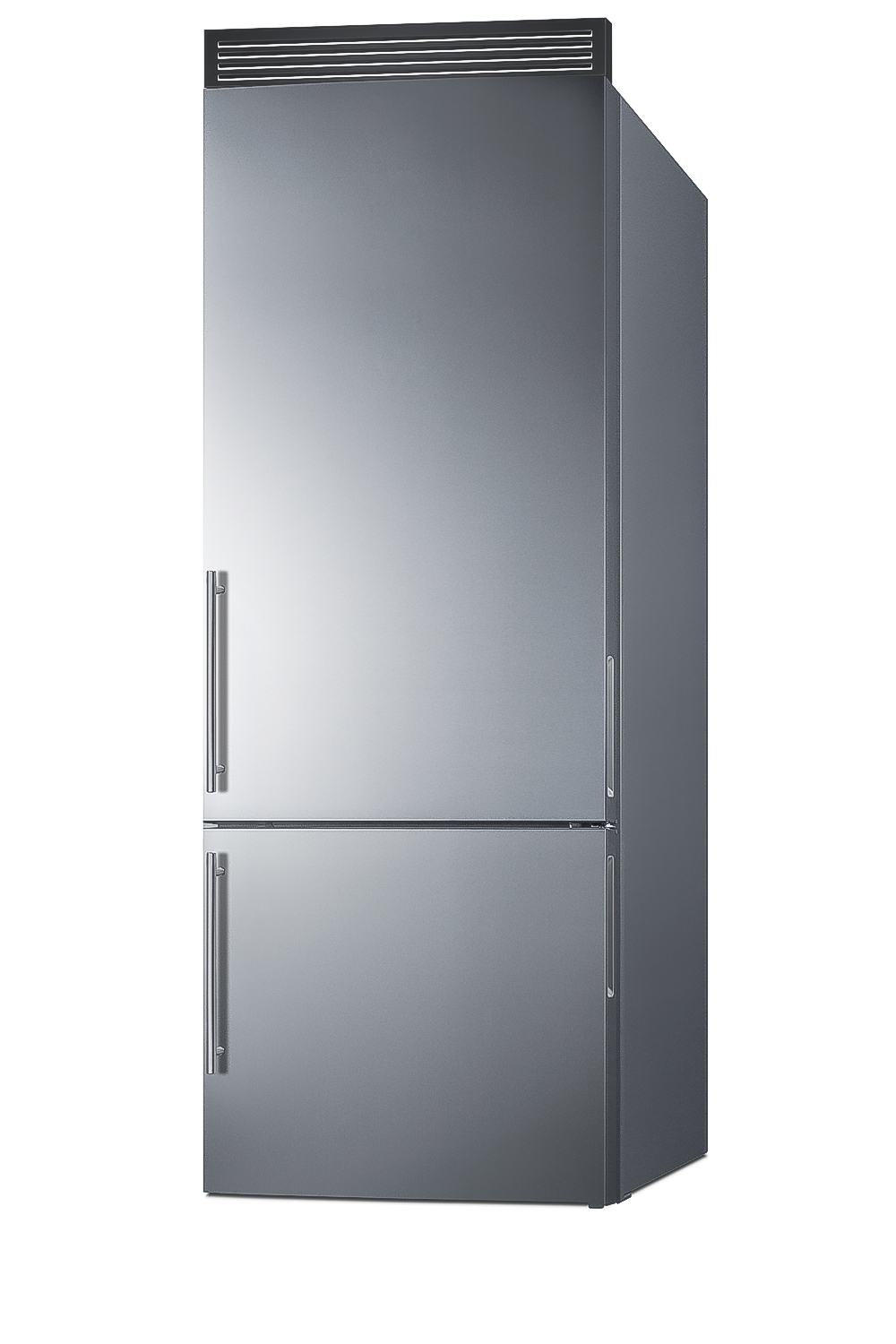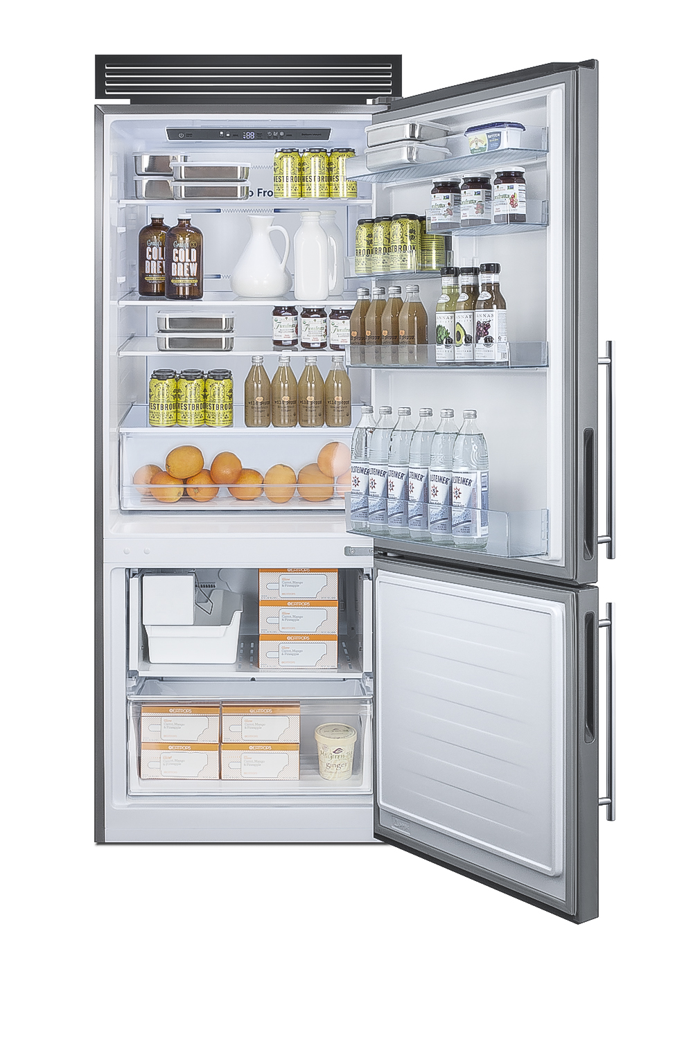 Summit's counter depth series of frost-free refrigerator-freezers provides attractive, user-friendly, and efficient solutions to bringing full storage convenience to small kitchen spaces.The FFBF279SSXIMH72 is conveniently sized at 27 5/8 inches wide and just under 27 inches deep, with a generous 14.6 cu.ft. capacity to meet a family's storage needs in minimum floor space. The stainless steel doors feature an attractive horizontal grain and stainless steel handles for a professional look. We include a decorative steel grill accessory in matte black for optional installation on top of the cabinet, allowing you to fill extra vertical space depending on your kitchen cabinetry height. This unit ships with a right hand swing (for a left hand version, see model FFBF279SSXIMH72LHD). The sealed back offers added space savings and easier cleanup. Inside, the FFBF279SSXIMH72 utilizes frost-free operation for low maintenance use. The digital controls ensure easy temperature management. It also includes a holiday setting, which allows the refrigerator to run at warmer temperatures to help save energy when not in use during vacation or other extended periods of inactivity. The refrigerator section features automatic LED lighting for an attractive, energy efficient view. Adjustable glass shelves and a full-width crisper drawer ensure easy storage. The door includes three full shelves and two adjustable half racks to best accommodate bottles and other condiments. The large freezer section features a factory-installed icemaker to keep a steady supply of crescent cubes on hand at all times. A side-out drawer in clear plastic helps to protect stored items from warmer temperature when the door is opened. A "super freeze" setting lets you run the freezer at colder temperatures, an ideal feature when loading new groceries. With its unique footprint and fully featured design, the FFBF279SSXIMH72 is a great solution for apartments and other space-challenged kitchens in need of a fully fun