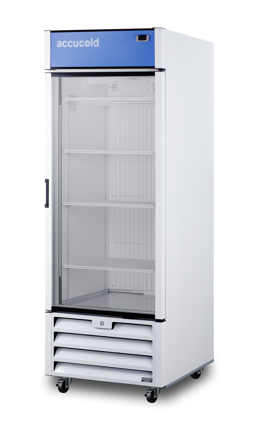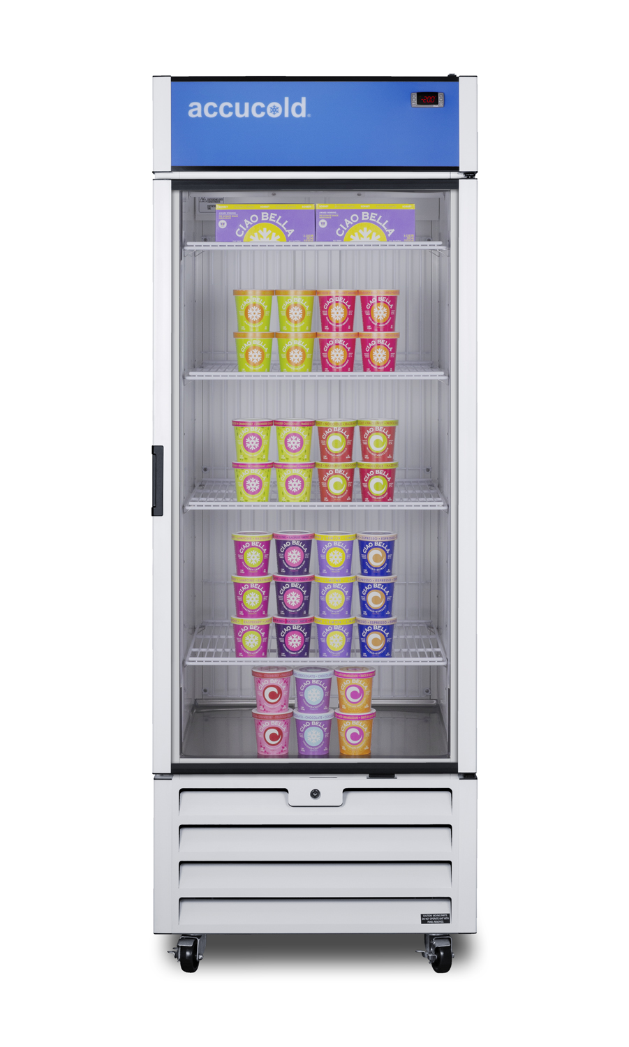 Made in North America, Accucold Commercial products offer the ideal display and storage conditions for foodservice settings, with a TAA compliant design and durable construction for busy commercial environments.Model SCFF262GRH is an upright frost-free freezer with a full 21.34 cu.ft. storage capacity. Ideal for hotel lobbies, this unit comes with a user-reversible double tempered glass door complete with LED lighting inside the panel to provide a bright view of stored items for maximum impulse sales. It can easily be paired with its matching refrigerator (model SCRR261GLH). The self-closing feature protects stored contents by ensuring they're not accidentally left exposed to ambient room temperatures. This unit includes a factory-installed keyed lock for security as needed.Inside, the SCFF262GRH utilizes fan-forced cooling for fast temperature recovery and even cold air distribution. Adjustable cantilevered shelving makes it easy to accommodate any sized item. This model uses frost-free operation for easy user maintenance, with audible high/low temperature alarms to warn if the unit goes out of range. The SCFF262GLH is UL-S listed to NSF-7 commercial standards. Eco-friendly R290a refrigerant helps to ensure a greener footprint compliant with the latest CARB regulations.In addition to this model, Accucold Commercial's North American line includes larger and smaller sizes to best fit your space. Explore the full selection or contact our product specialists for more information. Note: This unit ships with a user-reversible right hand door swing. If you would like this to ship with the door opening from the other side, see model SCFF262GLH.
