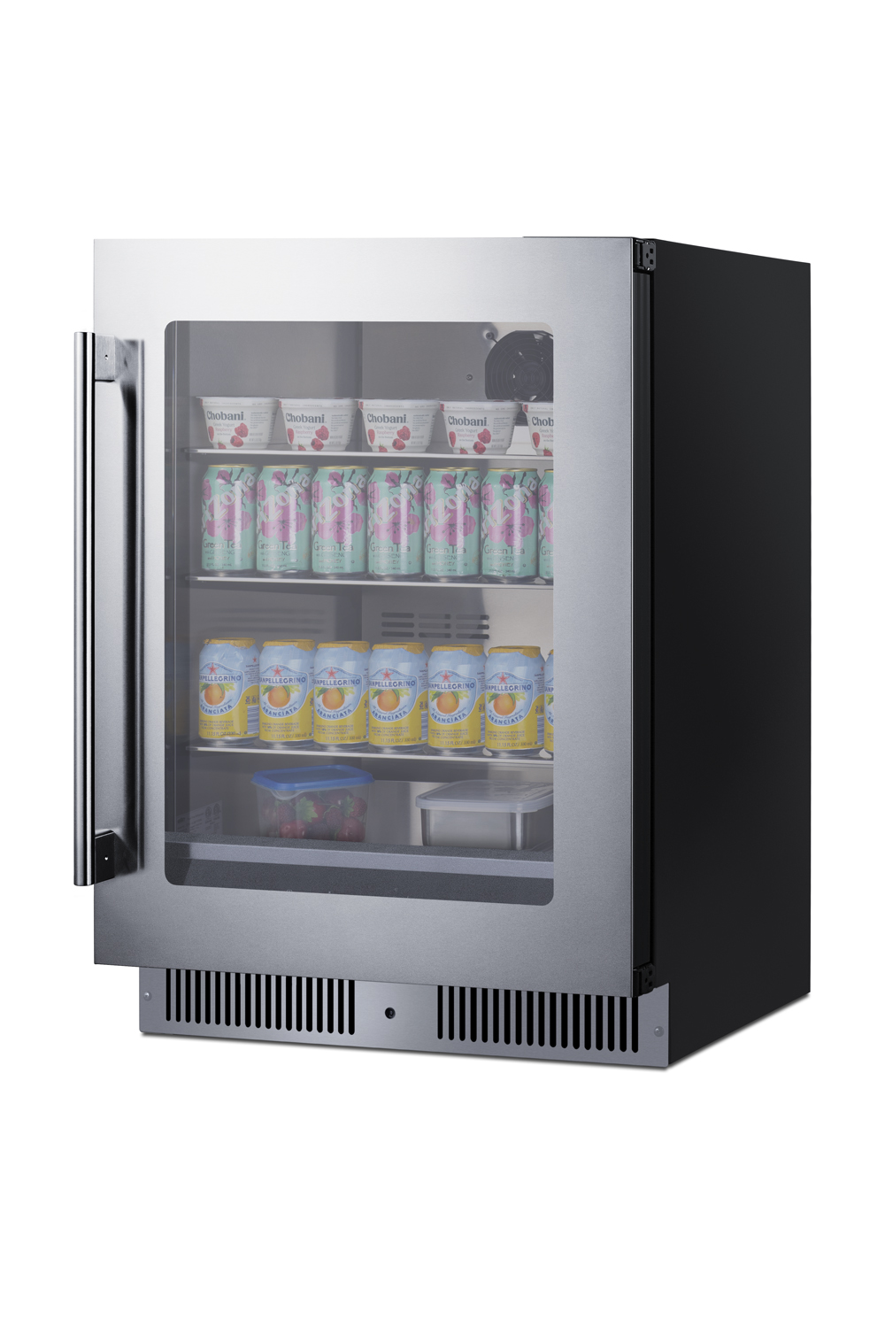Summit's shallow-depth series of built-in undercounter refrigeration brings full functionality to kitchen islands, wet bars, and other settings with space limitations.The SDHG2443 is a 24" wide beverage refrigerator, sized at just 18" deep. It comes in a 34" height to fit standard undercounter spaces. The front-breathing system allows built-in installation, while the fully finished black cabinet also allows freestanding use. Seamless, stylish stainless steel trim blends smoothly into the reversible double pane tempered glass door for an elevated look, with a professional stainless steel handle included. This unit has a sealed rear and right angle cord for a better fit. The fully articulating European hinge design ensures smoother opening. A lock is located in the kickplate for added convenience and security. The unit's interior features stainless steel construction for improved durability and sanitation. Fan-forced cooling ensures even temperature distribution and fast temperature recovery. This unit includes an LED strip on each side of the interior cabinet, with dimmable settings in a gentle white hue that lets you create the perfect display conditions. Glass shelves ensure flexible storage to accommodate any size. The angled digital thermostat makes temperature readout and management easy and intuitive, with indicator lights showing when the interior is ideal for chilling beverages between 36°F and 43°F.Additional features include an open-door alarm, a high-temperature alarm, and a Sabbath mode setting that turns off some electrical elements for up to 96 hours during observances.The SDHG2443 is ETL-S listed to NSF-7 commercial standards but can also be used in the home. Create a matching set by pairing this with our SDHW2442 wine cellar. Additional 18" deep choices are available in 15", 19", and 24" widths, including outdoor refrigerators, refrigerator drawers, wine cellars, and ADA-compliant options. For a panel-ready version, see model SDHG2443PNR.
