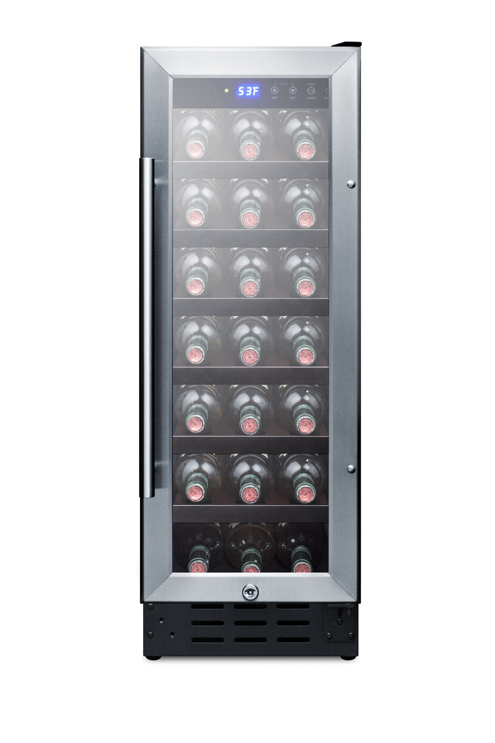 SUMMIT's collection of built-in wine cellars provides the perfect conditions for storing your collection under the counter.At just 12" wide, SUMMIT SWC1224B features a front-breathing design for built-in installation under counters, but also has a fully finished cabinet for alternate freestanding use. The interior can store up to 21 standard Bordeaux style or wider Burgundy style bottles. The reversible glass door features stainless steel trim and a professional handle, with a factory installed lock to prevent unsupervised access.Inside, the SWC1224B includes six wooden shelves in a jet black finish and a floor specially slotted to hold bottles. Recessed LED lighting offers an attractive and efficient display. The digital thermostat allows easy temperature management in Celsius or Fahrenheit, with indicator lights to show the proper storage temperature for red, white, or sparkling wine.With its slim fit and user-friendly features, the SWC1224B is perfect for a 12" cutout in any wet bar or kitchen. This unit is ETL-S listed to NSF-7 standards and meets UL-471. For a matching beverage center, see the SCR1225B.