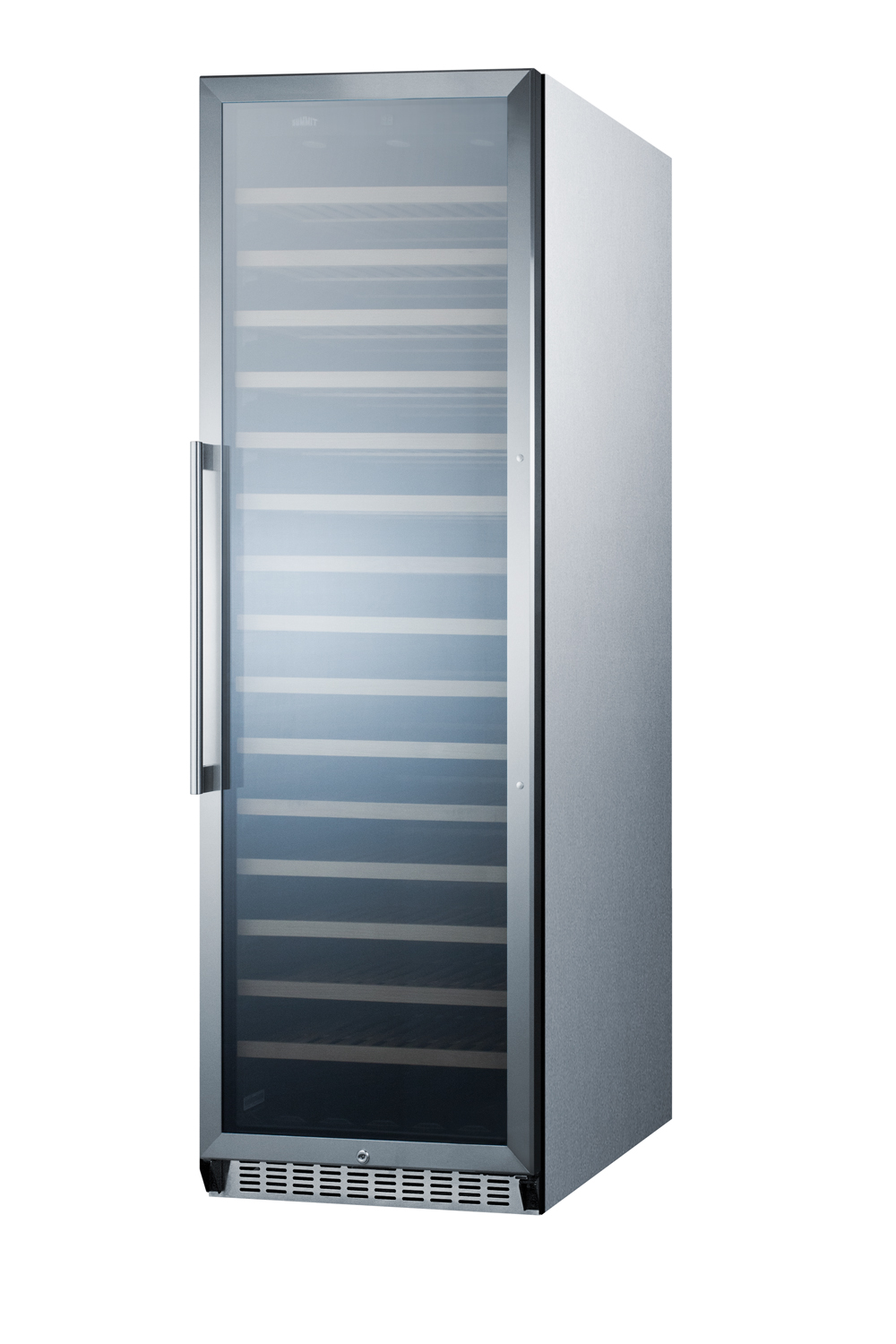 SUMMIT SWC1926CSS is a full-sized wine cellar designed for optimum wine storage with user-friendly convenience.Sized at just under 24" wide and 27" deep, the SWC1926CSS can store up to 171 standard 750ml Bordeaux bottles on slide-out wooden shelves. Alternatively, this unit can hold up to 128 wider Burgundy style bottles (typically used for Chardonnay or Pinot Noir) or a combination of 14 champagne bottles and 154 Bordeaux bottles. A digital thermostat makes it easy to adjust the temperature between 41ºF and 72ºF for red or white wine storage, with an LED temperature display that can be shown in Celsius or Fahrenheit. Recessed LED lighting offers an attractive touch. Additional features include a Sabbath mode setting, open door alarm, temperature memory function in case of power loss, and high temperature alarm for added protection.The SWC1926CSS has stainless steel wrapped cabinet finish and reversible stainless steel trimmed glass door that offers a full display of the interior. A sleek stainless steel handle completes the look, and a factory installed lock offers added security. This unit can be used freestanding or built-in with extra rear clearance. See the user manual for more information.With its ideal size and handy features, the SWC1926CSS is an elegant yet affordable wine cellar for full storage needs. For this unit with a dual zone design, see the SWC1966CSS.