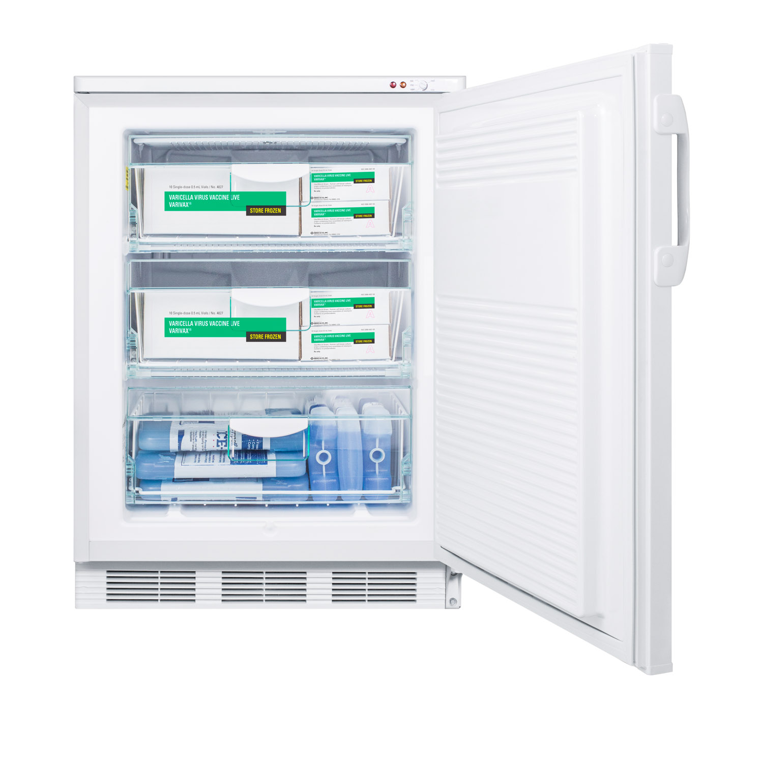 Accucold by Summit Appliance's MED series all-freezers come fully featured for stabilized temperature performance for use in medical, scientific, pharmaceutical, and laboratory institutions.The VT65MLMED has a 24" footprint designed for freestanding use. It comes in a white finish and includes a front-mounted lock for added security.The manual defrost VT65MLMED operates several degrees colder than most freezers for safe long-term storage of food, vaccines, or pharmaceuticals. Temperatures can reach and maintain -25º C. Three removable pull-out basket drawers provide convenient storage solutions, while extra thick insulation limits energy waste and keeps the cold inside. We include an audible NIST calibrated temperature alarm complete with an external display of the current and high/low temperature mounted on the door. A green dot hospital grade plug is installed for added safety in high traffic areas. An access port allows users to connect their own monitoring equipment. With its slim size and reliable construction, the VT65MLMED works well in any setting in need trusted storage. For a built-in version of this model, see the VT65MLBIMED. Additionally, we offer a variety of options to customize this unit, including USB data loggers, digital thermostats, self-closing doors, and more.NOTE: Accucold freezers are purpose-built to the support meeting the current CDC (Centers for Disease Control) guidelines for the storage of vaccines. As referenced in the current Vaccine Storage and Handling Toolkit, these units incorporate several key features for stable operation. For additional temperature assurance, the CDC recommends a calibrated digital data logger (DDL), which can be added with the factory-installed option DL2B or addition of the DL2BKit accessory. Select Accucold products have been tested and certified to the new NSF 456 standard, and are now available for purchase. For additional information, contact our products specialists.