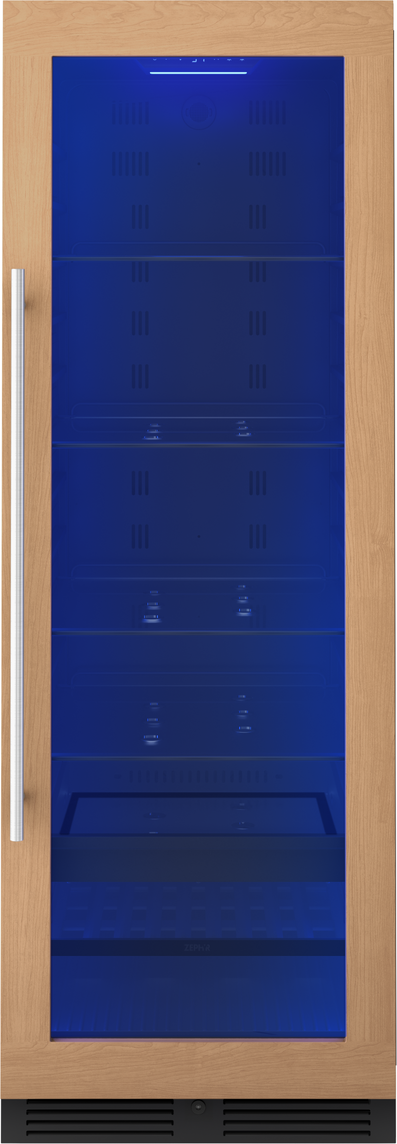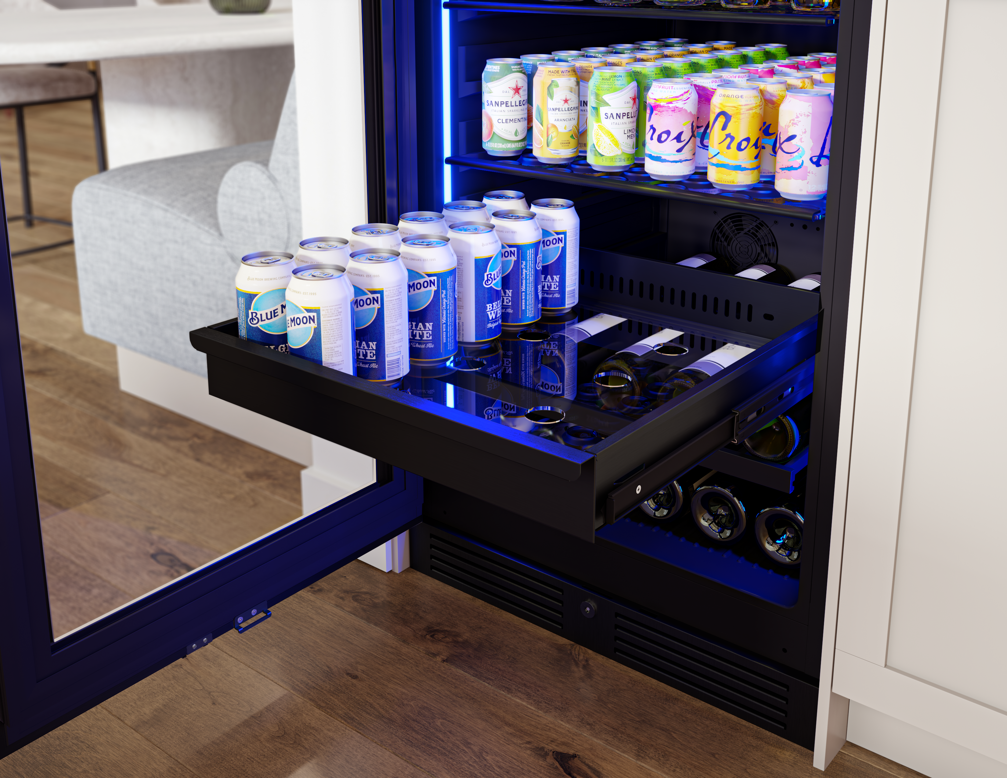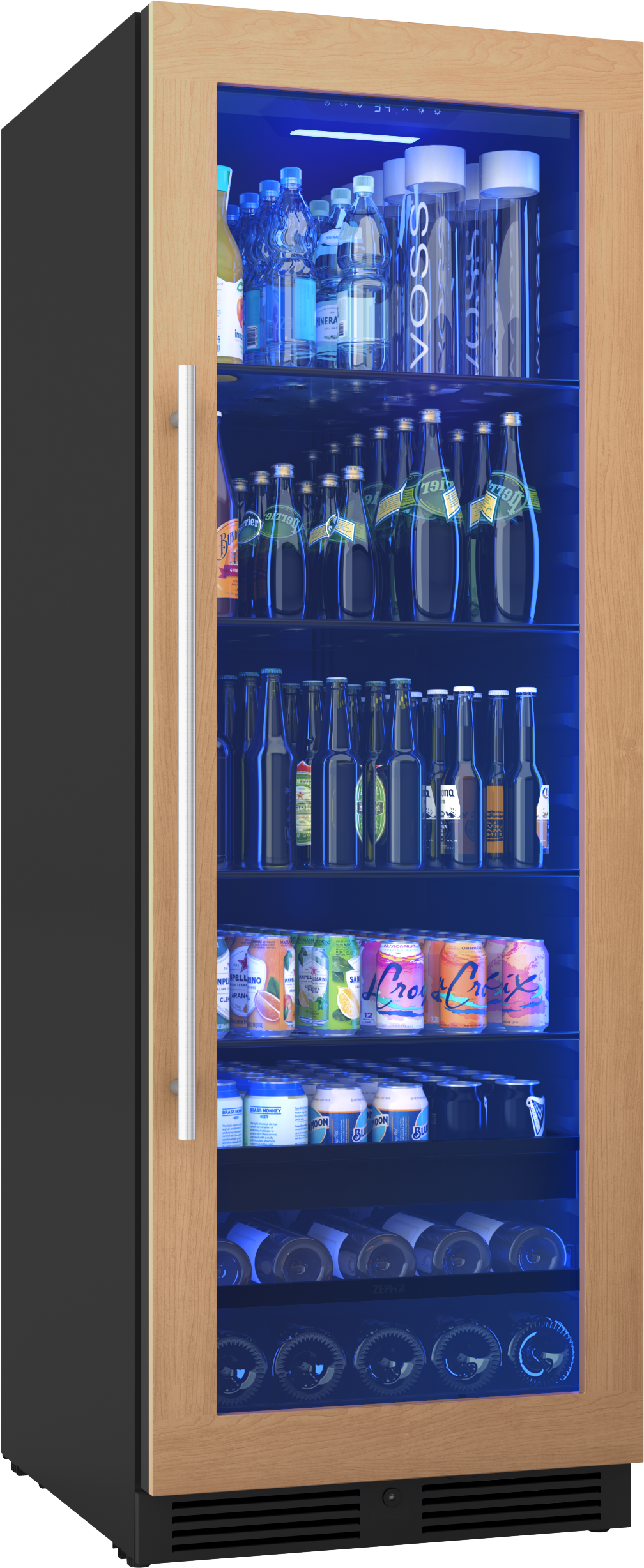 With tons of entertaining versatility and the ability to beautifully harmonize with your cabinetry, this Full Size Panel Ready Beverage Cooler stores your favorite wines and any other beverages with ease. Featuring Hettich™ articulating hinges, Full-Extension Wood Rack, Full-Extension Rollout Bin, vertical LED light strips in three colors and four light levels, an illuminated control panel, and an updated kickplate with built-in lock. Also boasts an auto-illuminating function that sets the lighting to the highest brightness level when the door opens for greater visibility. Door handle sold separately, and wood panel not included.