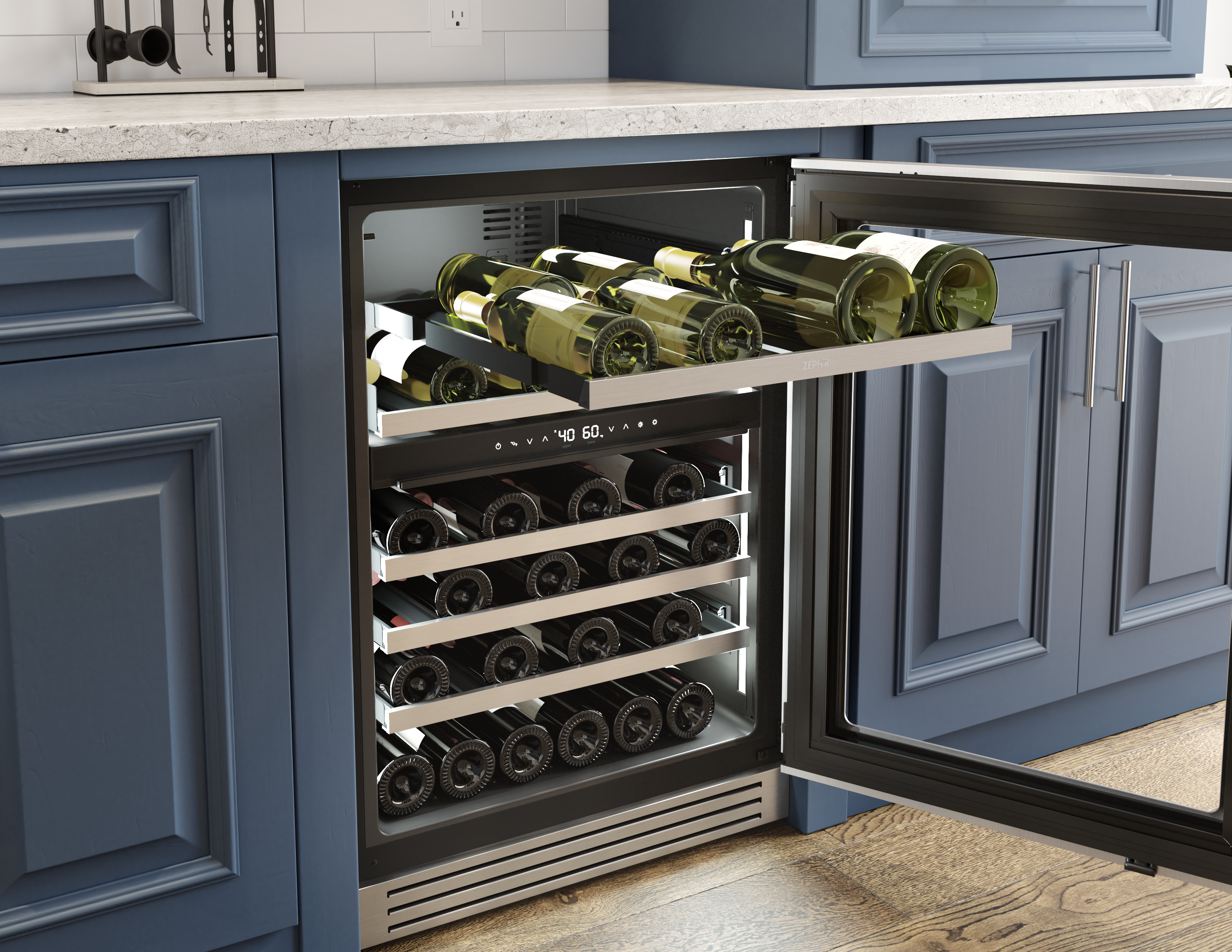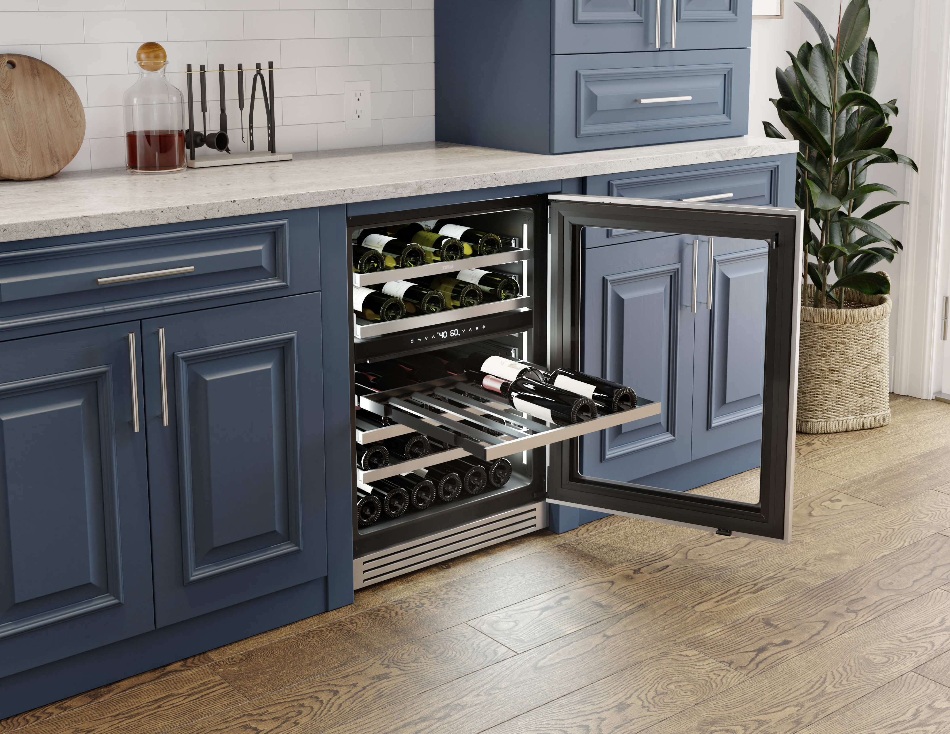 From bubbly to Barolo, store every precious bottle at just the right temperature, the way the pros do it. With the help of the quietest inverter compressor on the market, an easily removable kickplate, soft-close glides on wood racks, improved rack spacing, a magnum-ready top shelf and as much sleek, professional quality design as any kitchen desire, you’re ready to serve guests in style. And its good looks fit right in with your other pro-style appliances.
