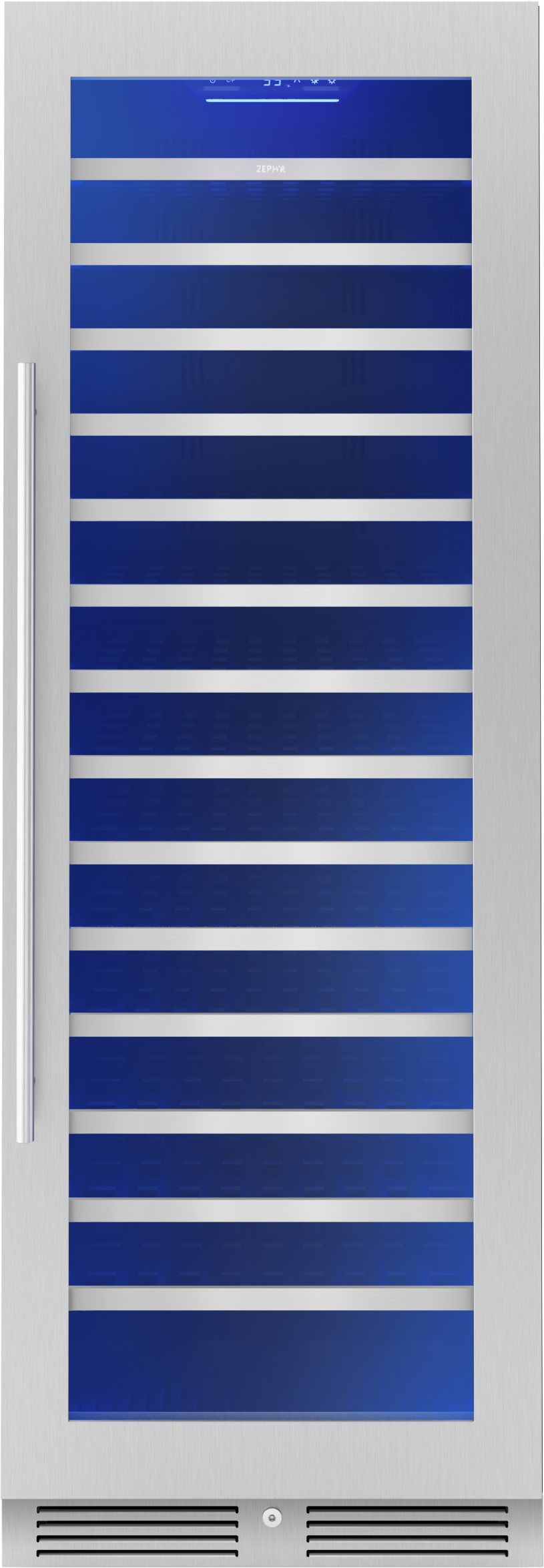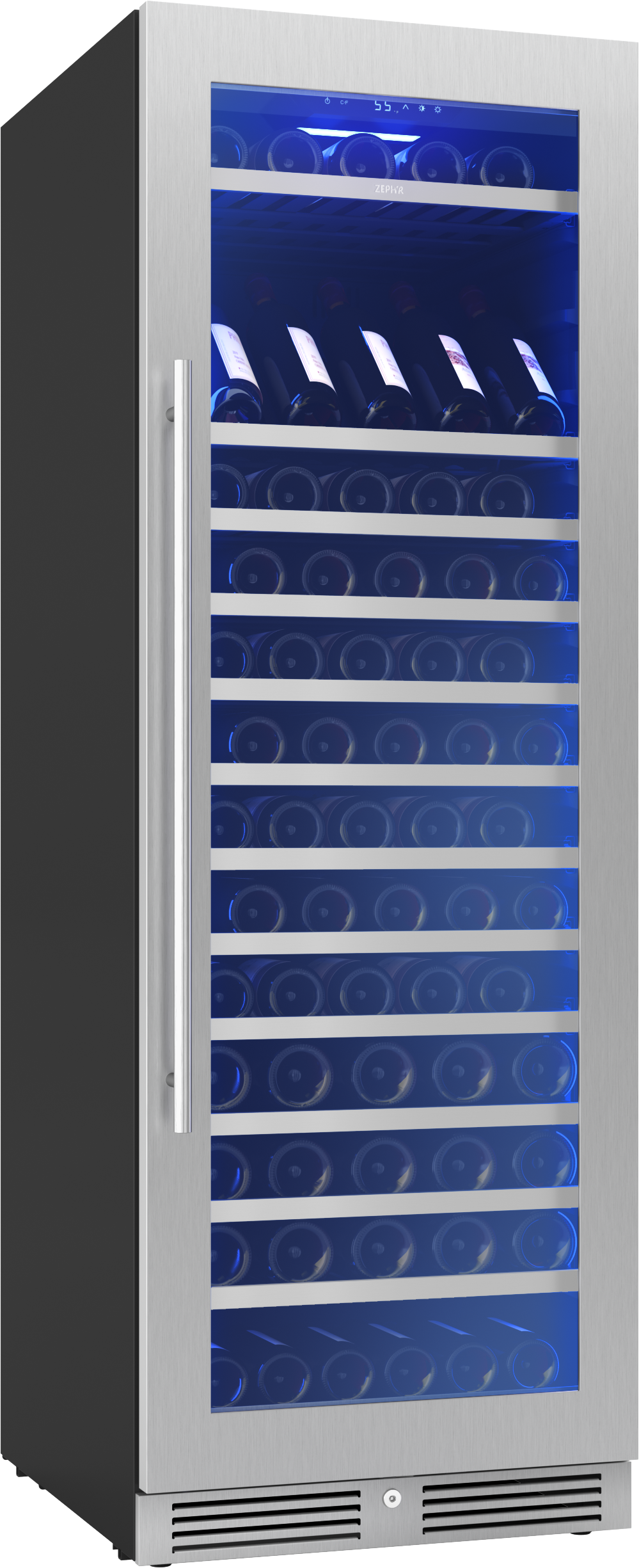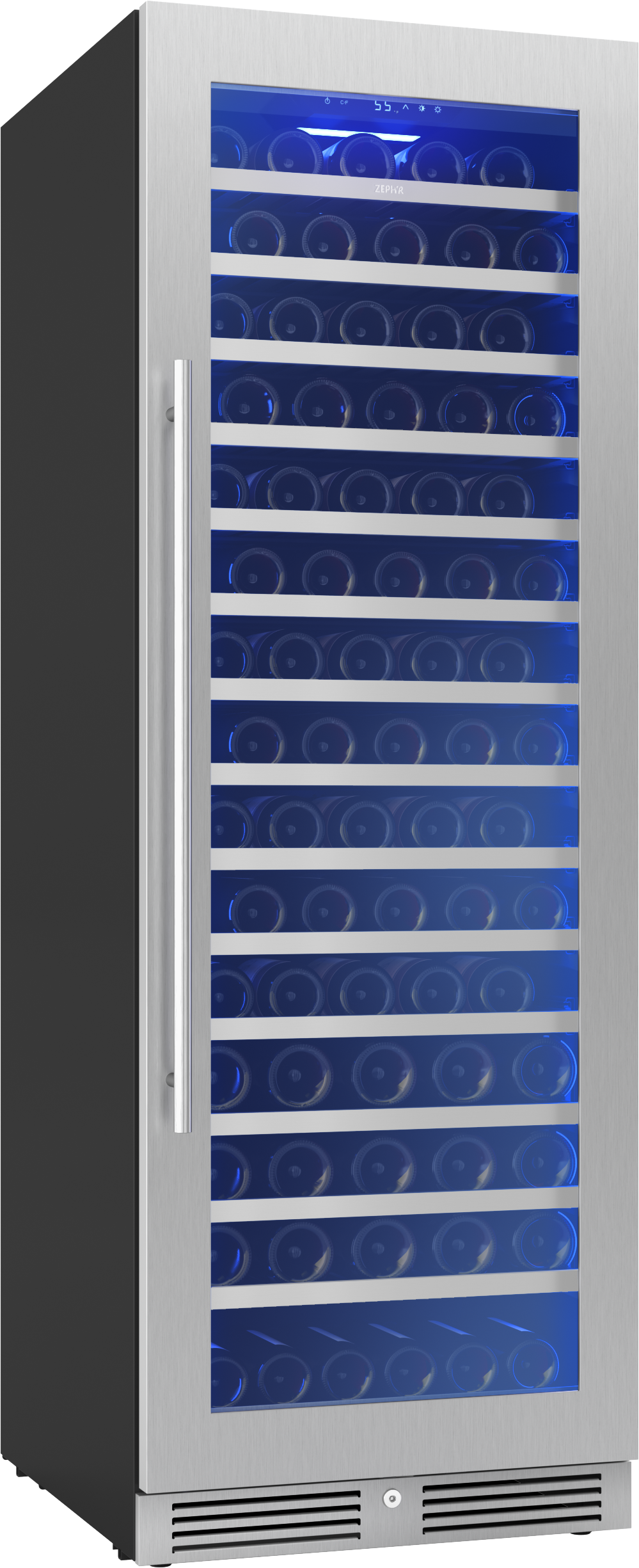 This stainless steel Full Size Single Zone Wine Cooler keeps your wine at optimal serving temperature so you can be ready for fun at a moment’s notice. Featuring Full-Extension Wood Racks to see every bottle – even those nestled in the back. Also boasts vertical LED light strips in three colors and four light levels, an illuminated control panel, an updated kickplate with built-in lock, and an auto-illuminating function that sets the lighting to the highest brightness level when the door opens for greater visibility.