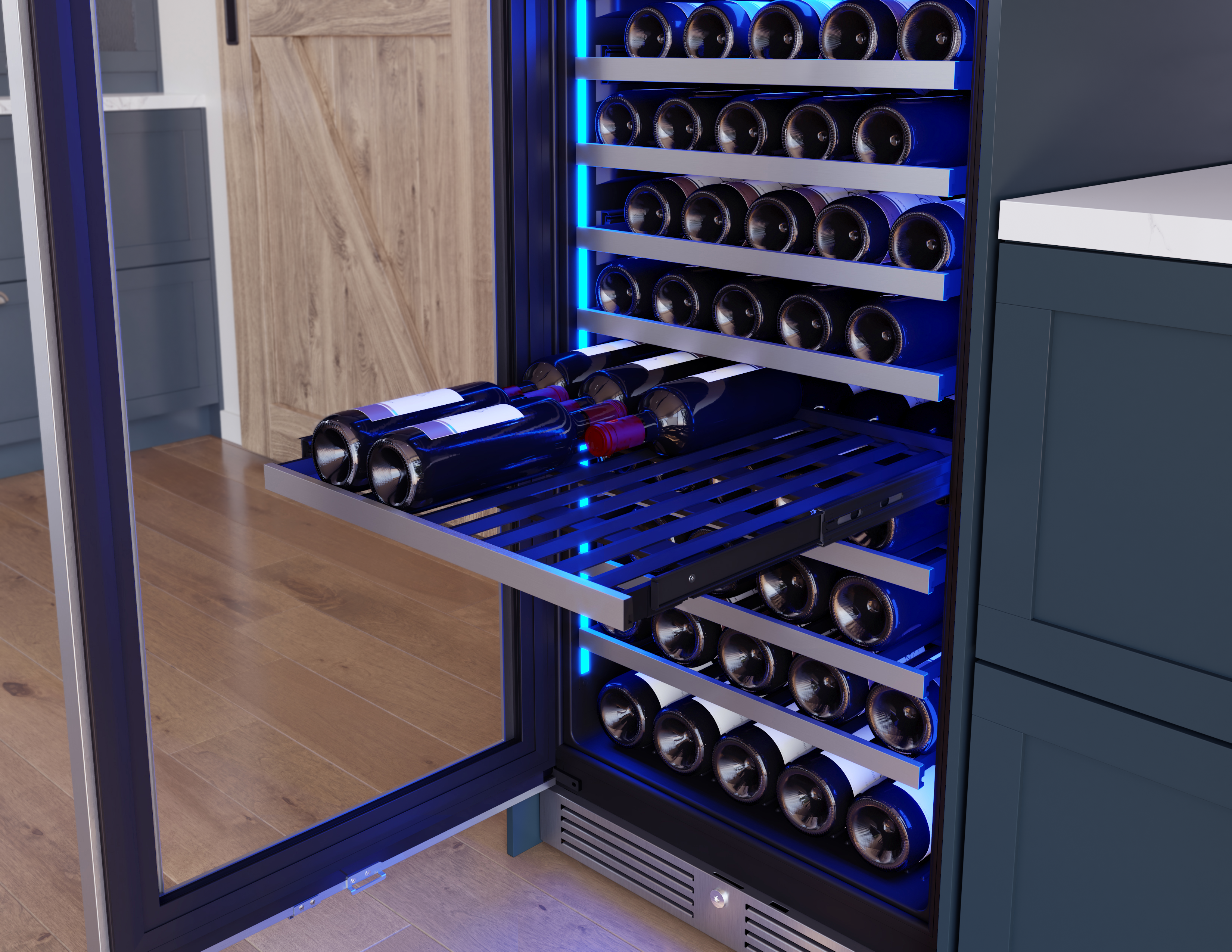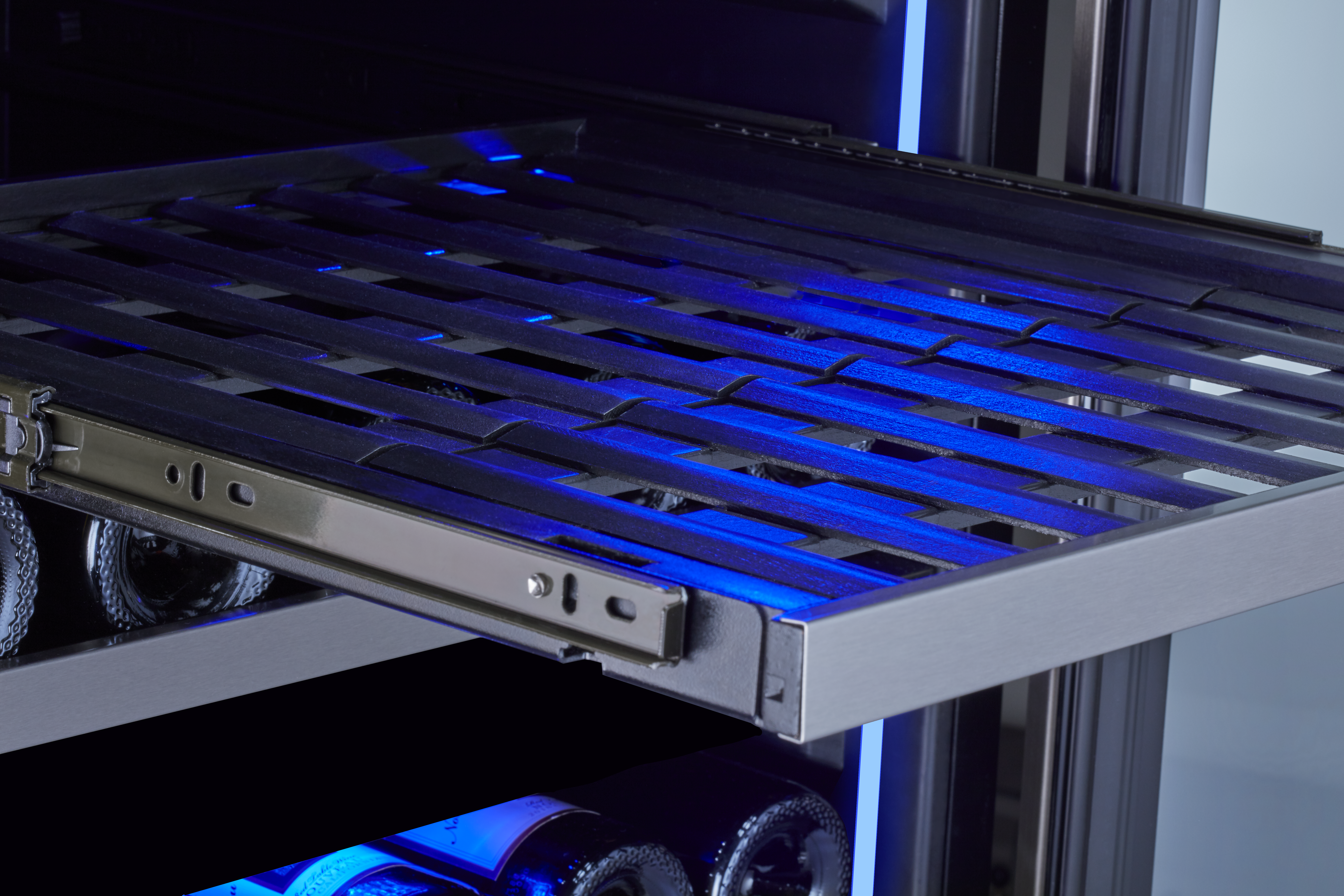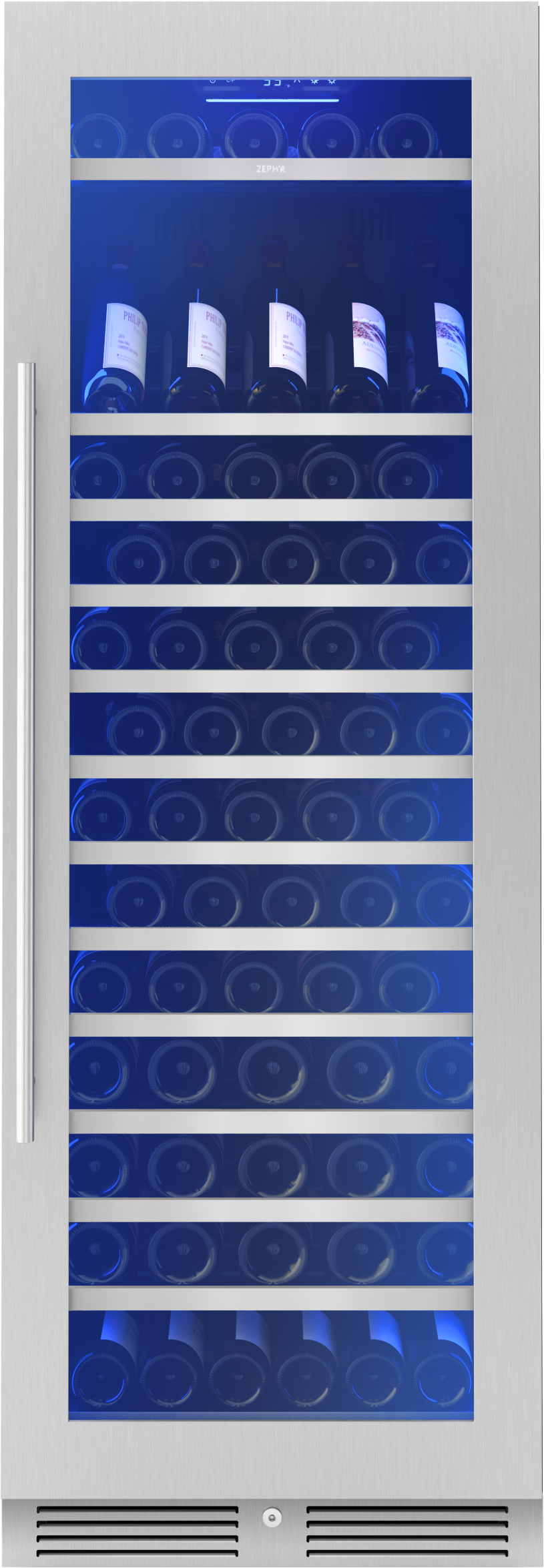 This stainless steel Full Size Single Zone Wine Cooler keeps your wine at optimal serving temperature so you can be ready for fun at a moment’s notice. Featuring Full-Extension Wood Racks to see every bottle – even those nestled in the back. Also boasts vertical LED light strips in three colors and four light levels, an illuminated control panel, an updated kickplate with built-in lock, and an auto-illuminating function that sets the lighting to the highest brightness level when the door opens for greater visibility.