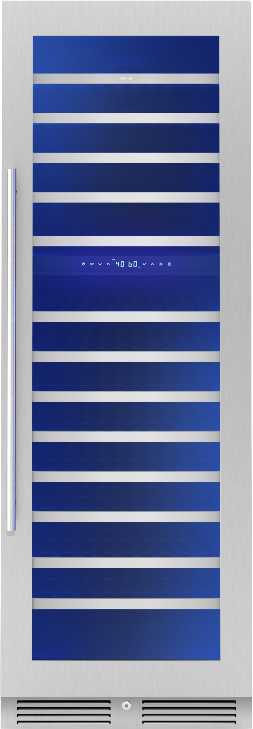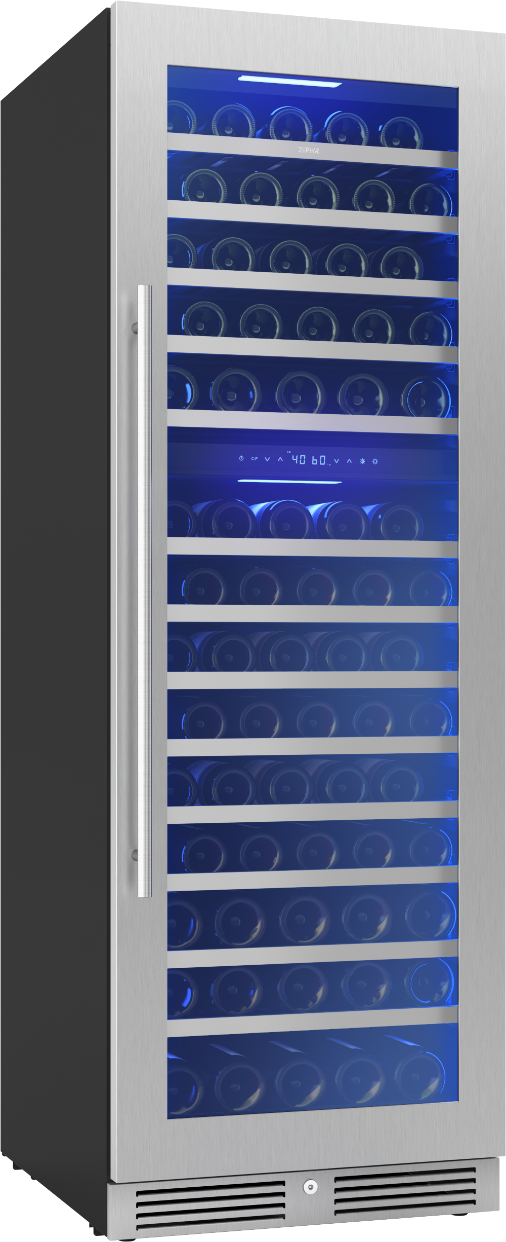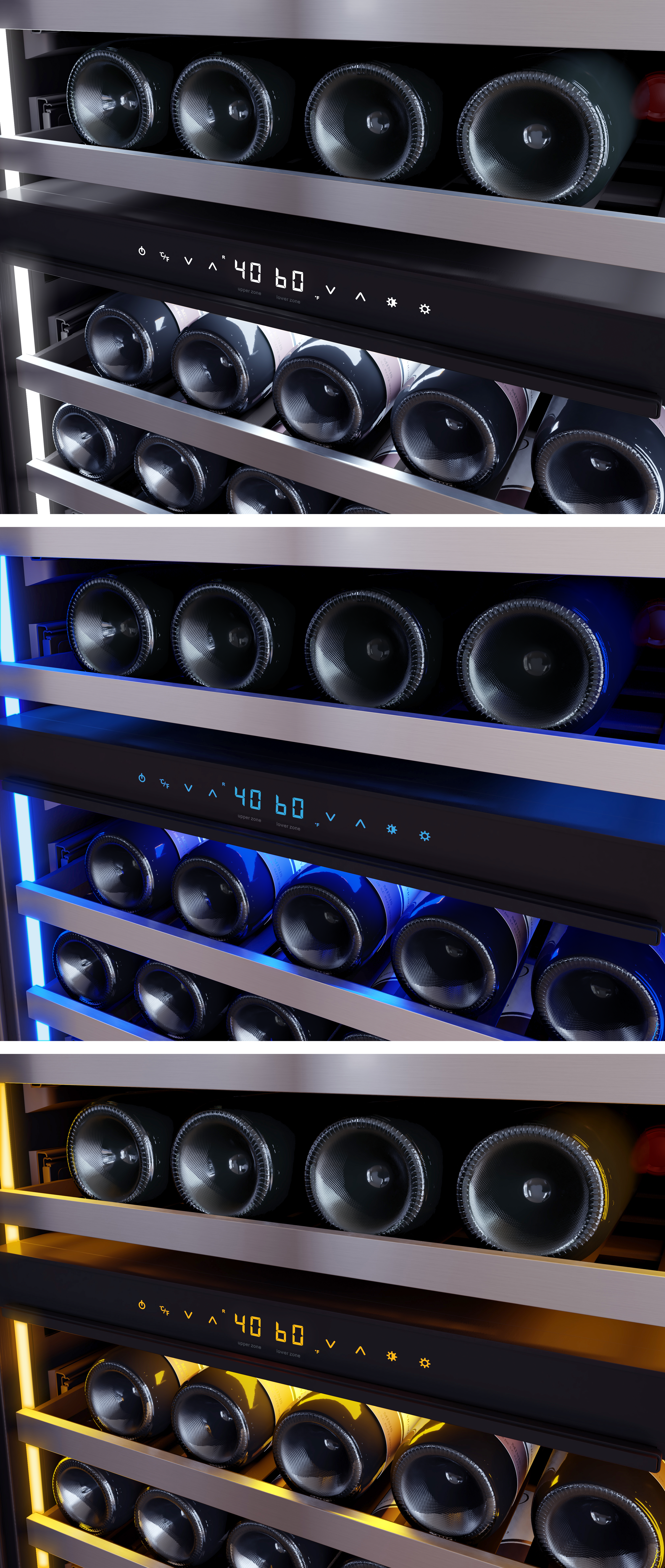 This sleek stainless steel Full Size Dual Zone Wine Cooler is ready to store your wines perfectly at two different serving temperatures and includes features such as Full-Extension Wood Racks, vertical LED light strips in three colors and four light levels, an illuminated control panel, and an updated kickplate with built-in lock. Also boasts an auto-illuminating function that sets the lighting to the highest brightness level when the door opens for greater visibility. Sleek, chic, and ready to serve.