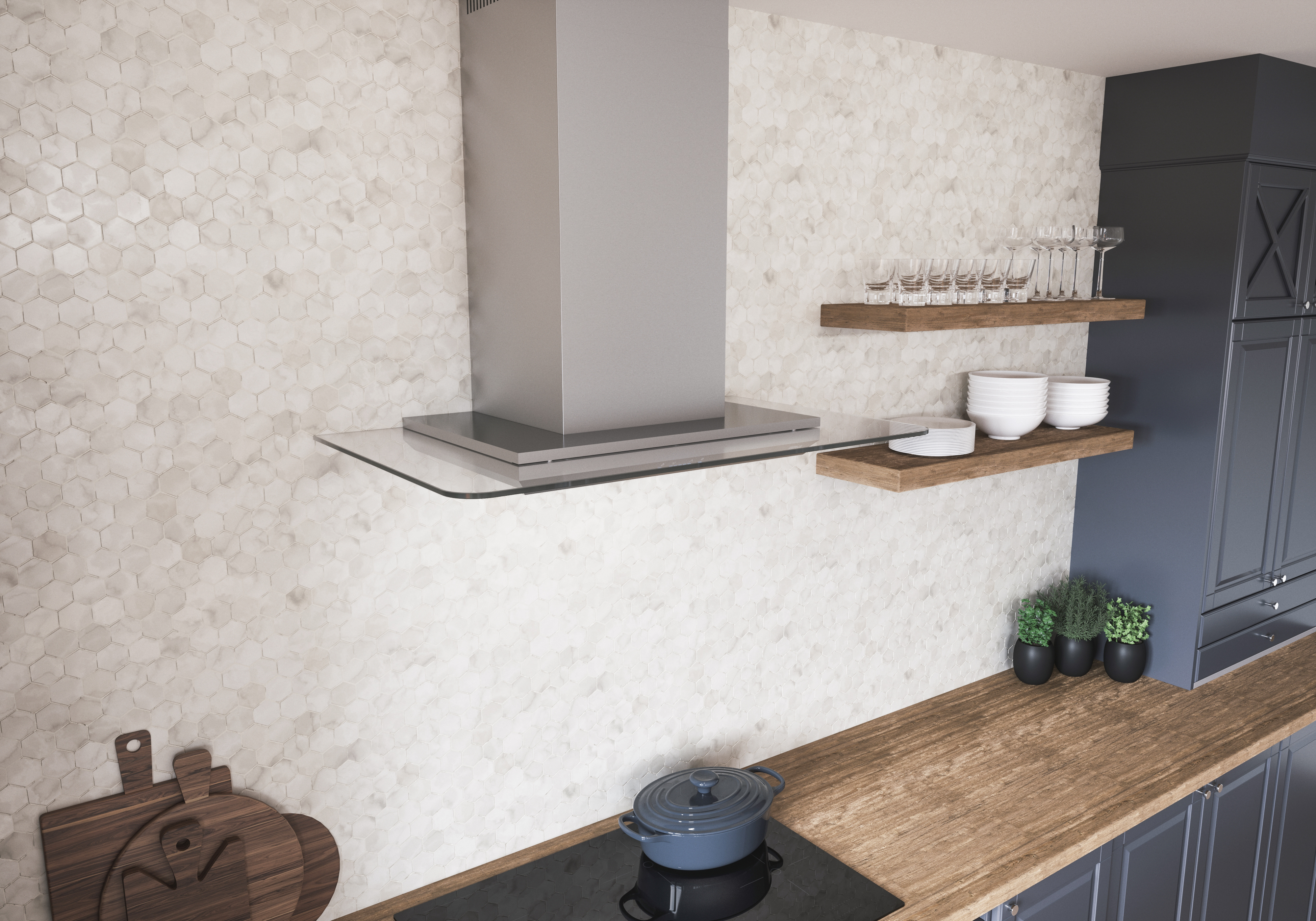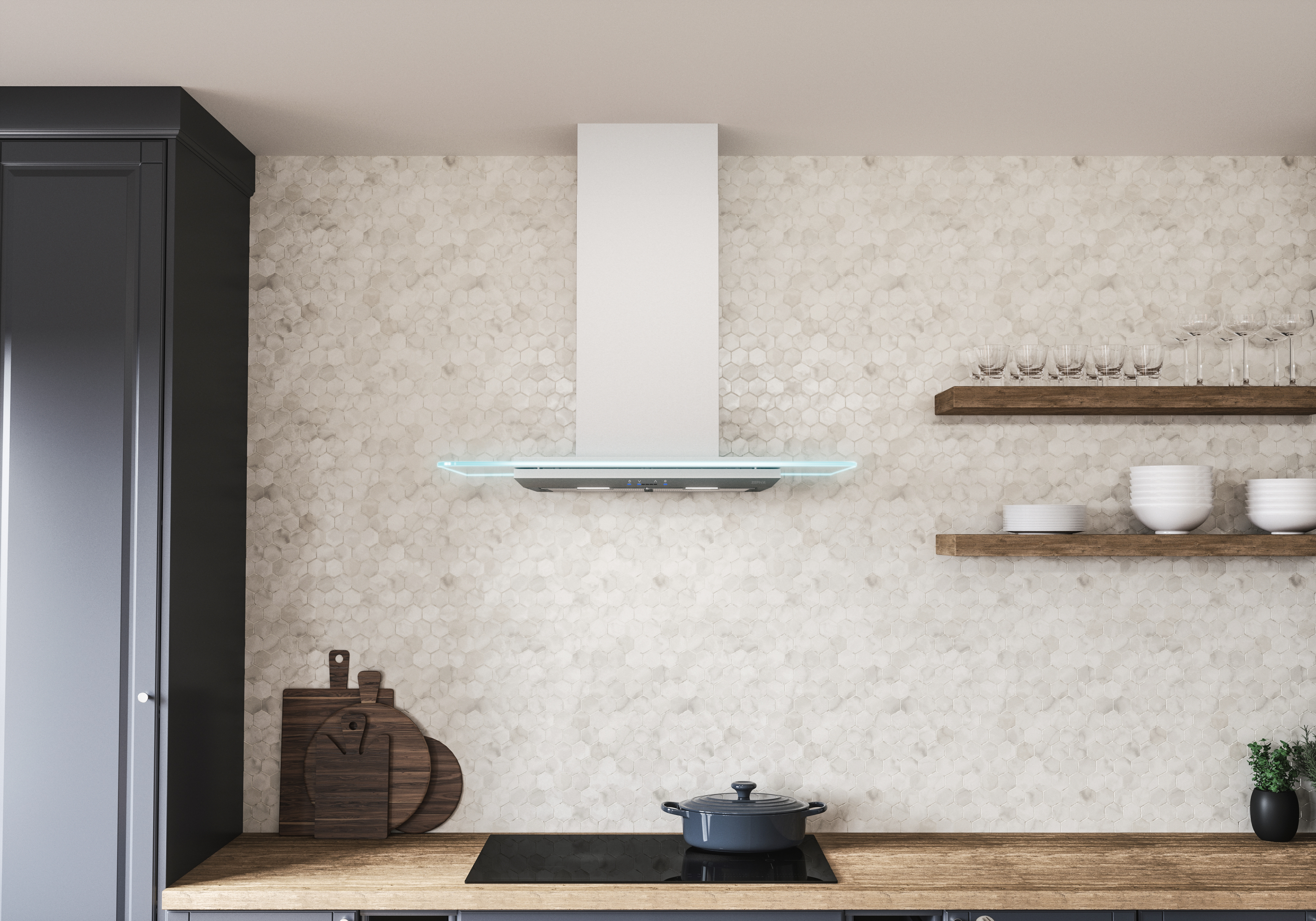 Verona is topped with a straight glass canopy that also serves as an ambiance setting LED display. Select the Cloud White, Deep Blue and Amber color options to best match your kitchen’s décor, or choose the Demo mode that displays all three settings in 10-second intervals. Verona includes LumiLight LED lighting and 5-speed ICON Touch® controls.
